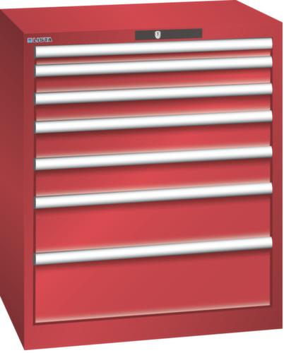 "longDescription": "LISTA Schubladenschrank, Lista Einheit: 36x27E, BxTxH: 717x572x850mm, Schubladen-Nutzfläche BxT: 612x459mm, Anzahl Schubladen: 7, Anzahl Fronthöhen (Tragkraft): 1x50mm (75kg), 2x75mm (75kg), 2x100mm (75kg), 1x150mm (75kg), 1x200mm (75kg), Schliessart: Code Lock, elektronisches Zahlenschloss mit 10 Ziffern für 4- bis 6-stellige Codes, bis 100 Codes, Farbe Gehäuse: Rubinrot RAL 3003, Farbe Schubladen: Rubinrot RAL 3003. Höchste Stabilität: Gehäuse bis 4t belastbar, Schubladen mit 75 oder 200 kg Tragkraft. Maximale Ausnutzung dank Vollauszug und optimaler Mantelhöhe der Schubladen. Exzellente Schutzeigenschaften gegen Schmutz, Flüssigkeiten und mechanische Beanspruchung durch geschlossenes Gehäuse mit schlag- und abriebfester Oberfläche. Überzeugende Sicherheit: Aushebesicherung gegen Herausfallen der Schubladen und Einzelschubladensperre als Kippschutz. Korrosionsschutz durch Elektrophorese-Tauchlackierung und umweltfreundlichen Pulverlack. Optimale Ordnung und Organisation dank speziellem LISTA-Einteilungsmaterial für jeden Zweck und gelochter, geschlitzter Schubladen. Professionelle Beschriftung mit Beschriftungssoftware LISTA Script und hochklappbarer Griffleiste zum Einlegen der Etiketten. Perfekte Laufruhe durch traversenlos geführten Differenzialauszug. Flexible Anpassungsmöglichkeiten durch vorperforierte Löcher für Tischplatten (Punchout), Rollen, Schubladen, Schliesssysteme für einfaches Um- und Nachrüsten<br>",