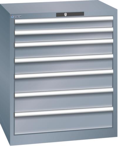 "longDescription": "LISTA Schubladenschrank, Lista Einheit: 36x27E, BxTxH: 717x572x850mm, Schubladen-Nutzfläche BxT: 612x459mm, Anzahl Schubladen: 7, Anzahl Fronthöhen (Tragkraft): 2x75mm (75kg), 2x100mm (75kg), 2x125mm (75kg), 1x150mm (75kg), Schliessart: Key Lock, Standard-Schliessung mit Wechselyzlinder inkl. 2 Schlüsseln mit Schlüsselnummer, Farbe Gehäuse: Grau metallic NCS S 6502-B, Farbe Schubladen: Grau metallic NCS S 6502-B. Höchste Stabilität: Gehäuse bis 4t belastbar, Schubladen mit 75 oder 200 kg Tragkraft. Maximale Ausnutzung dank Vollauszug und optimaler Mantelhöhe der Schubladen. Exzellente Schutzeigenschaften gegen Schmutz, Flüssigkeiten und mechanische Beanspruchung durch geschlossenes Gehäuse mit schlag- und abriebfester Oberfläche. Überzeugende Sicherheit: Aushebesicherung gegen Herausfallen der Schubladen und Einzelschubladensperre als Kippschutz. Korrosionsschutz durch Elektrophorese-Tauchlackierung und umweltfreundlichen Pulverlack. Optimale Ordnung und Organisation dank speziellem LISTA-Einteilungsmaterial für jeden Zweck und gelochter, geschlitzter Schubladen. Professionelle Beschriftung mit Beschriftungssoftware LISTA Script und hochklappbarer Griffleiste zum Einlegen der Etiketten. Perfekte Laufruhe durch traversenlos geführten Differenzialauszug. Flexible Anpassungsmöglichkeiten durch vorperforierte Löcher für Tischplatten (Punchout), Rollen, Schubladen, Schliesssysteme für einfaches Um- und Nachrüsten<br>",