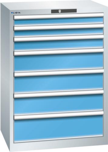 "longDescription": "LISTA Schubladenschrank, Lista Einheit: 36x27E, BxTxH: 717x572x1000mm, Schubladen-Nutzfläche BxT: 612x459mm, Anzahl Schubladen: 7, Anzahl Fronthöhen (Tragkraft): 2x75mm (75kg), 1x100mm (75kg), 3x150mm (75kg), 1x200mm (75kg), Schliessart: Code Lock, elektronisches Zahlenschloss mit 10 Ziffern für 4- bis 6-stellige Codes, bis 100 Codes, Farbe Gehäuse: Lichtgrau RAL 7035, Farbe Schubladen: Lichtblau RAL 5012. Höchste Stabilität: Gehäuse bis 4t belastbar, Schubladen mit 75 oder 200 kg Tragkraft. Maximale Ausnutzung dank Vollauszug und optimaler Mantelhöhe der Schubladen. Exzellente Schutzeigenschaften gegen Schmutz, Flüssigkeiten und mechanische Beanspruchung durch geschlossenes Gehäuse mit schlag- und abriebfester Oberfläche. Überzeugende Sicherheit: Aushebesicherung gegen Herausfallen der Schubladen und Einzelschubladensperre als Kippschutz. Korrosionsschutz durch Elektrophorese-Tauchlackierung und umweltfreundlichen Pulverlack. Optimale Ordnung und Organisation dank speziellem LISTA-Einteilungsmaterial für jeden Zweck und gelochter, geschlitzter Schubladen. Professionelle Beschriftung mit Beschriftungssoftware LISTA Script und hochklappbarer Griffleiste zum Einlegen der Etiketten. Perfekte Laufruhe durch traversenlos geführten Differenzialauszug. Flexible Anpassungsmöglichkeiten durch vorperforierte Löcher für Tischplatten (Punchout), Rollen, Schubladen, Schliesssysteme für einfaches Um- und Nachrüsten<br>",