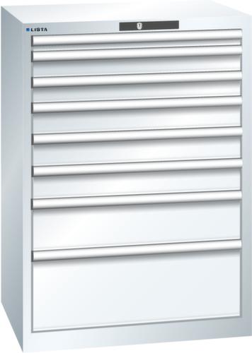 "longDescription": "LISTA Schubladenschrank, Lista Einheit: 36x27E, BxTxH: 717x572x1000mm, Schubladen-Nutzfläche BxT: 612x459mm, Anzahl Schubladen: 8, Anzahl Fronthöhen (Tragkraft): 1x50mm (75kg), 2x75mm (75kg), 3x100mm (75kg), 1x150mm (75kg), 1x250mm (75kg), Schliessart: Code Lock, elektronisches Zahlenschloss mit 10 Ziffern für 4- bis 6-stellige Codes, bis 100 Codes, Farbe Gehäuse: Reinweiss RAL 9010, Farbe Schubladen: Reinweiss RAL 9010. Höchste Stabilität: Gehäuse bis 4t belastbar, Schubladen mit 75 oder 200 kg Tragkraft. Maximale Ausnutzung dank Vollauszug und optimaler Mantelhöhe der Schubladen. Exzellente Schutzeigenschaften gegen Schmutz, Flüssigkeiten und mechanische Beanspruchung durch geschlossenes Gehäuse mit schlag- und abriebfester Oberfläche. Überzeugende Sicherheit: Aushebesicherung gegen Herausfallen der Schubladen und Einzelschubladensperre als Kippschutz. Korrosionsschutz durch Elektrophorese-Tauchlackierung und umweltfreundlichen Pulverlack. Optimale Ordnung und Organisation dank speziellem LISTA-Einteilungsmaterial für jeden Zweck und gelochter, geschlitzter Schubladen. Professionelle Beschriftung mit Beschriftungssoftware LISTA Script und hochklappbarer Griffleiste zum Einlegen der Etiketten. Perfekte Laufruhe durch traversenlos geführten Differenzialauszug. Flexible Anpassungsmöglichkeiten durch vorperforierte Löcher für Tischplatten (Punchout), Rollen, Schubladen, Schliesssysteme für einfaches Um- und Nachrüsten<br>",