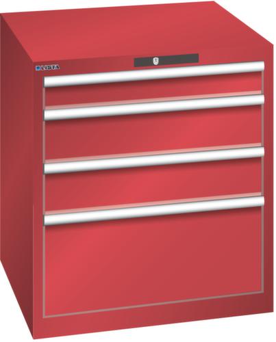 "longDescription": "LISTA Schubladenschrank, Lista Einheit: 36x36E, BxTxH: 717x725x800mm, Schubladen-Nutzfläche BxT: 612x612mm, Anzahl Schubladen: 4, Anzahl Fronthöhen (Tragkraft): 1x100mm (75kg), 2x150mm (75kg), 1x300mm (75kg), Schliessart: Key Lock, Standard-Schliessung mit Wechselyzlinder inkl. 2 Schlüsseln mit Schlüsselnummer, Farbe Gehäuse: Rubinrot RAL 3003, Farbe Schubladen: Rubinrot RAL 3003. Höchste Stabilität: Gehäuse bis 4t belastbar, Schubladen mit 75 oder 200 kg Tragkraft. Maximale Ausnutzung dank Vollauszug und optimaler Mantelhöhe der Schubladen. Exzellente Schutzeigenschaften gegen Schmutz, Flüssigkeiten und mechanische Beanspruchung durch geschlossenes Gehäuse mit schlag- und abriebfester Oberfläche. Überzeugende Sicherheit: Aushebesicherung gegen Herausfallen der Schubladen und Einzelschubladensperre als Kippschutz. Korrosionsschutz durch Elektrophorese-Tauchlackierung und umweltfreundlichen Pulverlack. Optimale Ordnung und Organisation dank speziellem LISTA-Einteilungsmaterial für jeden Zweck und gelochter, geschlitzter Schubladen. Professionelle Beschriftung mit Beschriftungssoftware LISTA Script und hochklappbarer Griffleiste zum Einlegen der Etiketten. Perfekte Laufruhe durch traversenlos geführten Differenzialauszug. Flexible Anpassungsmöglichkeiten durch vorperforierte Löcher für Tischplatten (Punchout), Rollen, Schubladen, Schliesssysteme für einfaches Um- und Nachrüsten<br>",