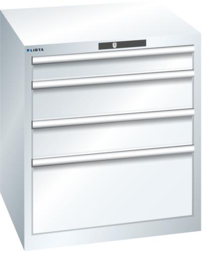 "longDescription": "LISTA Schubladenschrank, Lista Einheit: 36x36E, BxTxH: 717x725x800mm, Schubladen-Nutzfläche BxT: 612x612mm, Anzahl Schubladen: 4, Anzahl Fronthöhen (Tragkraft): 1x100mm (75kg), 2x150mm (75kg), 1x300mm (75kg), Schliessart: Code Lock, elektronisches Zahlenschloss mit 10 Ziffern für 4- bis 6-stellige Codes, bis 100 Codes, Farbe Gehäuse: Reinweiss RAL 9010, Farbe Schubladen: Reinweiss RAL 9010. Höchste Stabilität: Gehäuse bis 4t belastbar, Schubladen mit 75 oder 200 kg Tragkraft. Maximale Ausnutzung dank Vollauszug und optimaler Mantelhöhe der Schubladen. Exzellente Schutzeigenschaften gegen Schmutz, Flüssigkeiten und mechanische Beanspruchung durch geschlossenes Gehäuse mit schlag- und abriebfester Oberfläche. Überzeugende Sicherheit: Aushebesicherung gegen Herausfallen der Schubladen und Einzelschubladensperre als Kippschutz. Korrosionsschutz durch Elektrophorese-Tauchlackierung und umweltfreundlichen Pulverlack. Optimale Ordnung und Organisation dank speziellem LISTA-Einteilungsmaterial für jeden Zweck und gelochter, geschlitzter Schubladen. Professionelle Beschriftung mit Beschriftungssoftware LISTA Script und hochklappbarer Griffleiste zum Einlegen der Etiketten. Perfekte Laufruhe durch traversenlos geführten Differenzialauszug. Flexible Anpassungsmöglichkeiten durch vorperforierte Löcher für Tischplatten (Punchout), Rollen, Schubladen, Schliesssysteme für einfaches Um- und Nachrüsten<br>",