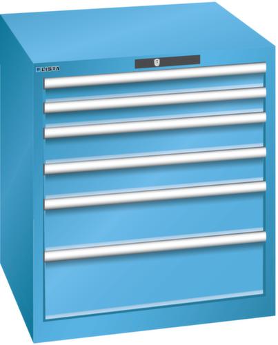 "longDescription": "LISTA Schubladenschrank, Lista Einheit: 36x36E, BxTxH: 717x725x800mm, Schubladen-Nutzfläche BxT: 612x612mm, Anzahl Schubladen: 6, Anzahl Fronthöhen (Tragkraft): 2x75mm (75kg), 2x100mm (75kg), 1x150mm (75kg), 1x200mm (75kg), Schliessart: Key Lock, Standard-Schliessung mit Wechselyzlinder inkl. 2 Schlüsseln mit Schlüsselnummer, Farbe Gehäuse: Lichtblau RAL 5012, Farbe Schubladen: Lichtblau RAL 5012. Höchste Stabilität: Gehäuse bis 4t belastbar, Schubladen mit 75 oder 200 kg Tragkraft. Maximale Ausnutzung dank Vollauszug und optimaler Mantelhöhe der Schubladen. Exzellente Schutzeigenschaften gegen Schmutz, Flüssigkeiten und mechanische Beanspruchung durch geschlossenes Gehäuse mit schlag- und abriebfester Oberfläche. Überzeugende Sicherheit: Aushebesicherung gegen Herausfallen der Schubladen und Einzelschubladensperre als Kippschutz. Korrosionsschutz durch Elektrophorese-Tauchlackierung und umweltfreundlichen Pulverlack. Optimale Ordnung und Organisation dank speziellem LISTA-Einteilungsmaterial für jeden Zweck und gelochter, geschlitzter Schubladen. Professionelle Beschriftung mit Beschriftungssoftware LISTA Script und hochklappbarer Griffleiste zum Einlegen der Etiketten. Perfekte Laufruhe durch traversenlos geführten Differenzialauszug. Flexible Anpassungsmöglichkeiten durch vorperforierte Löcher für Tischplatten (Punchout), Rollen, Schubladen, Schliesssysteme für einfaches Um- und Nachrüsten<br>",