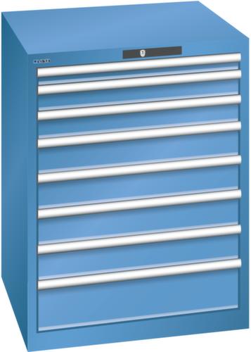 "longDescription": "LISTA Schubladenschrank, Lista Einheit: 36x36E, BxTxH: 717x725x850mm, Schubladen-Nutzfläche BxT: 612x612mm, Anzahl Schubladen: 8, Anzahl Fronthöhen (Tragkraft): 1x 50mm (75kg), 2x 75mm (75kg), 4x100mm (75kg), 1x150mm (75kg), Schliessart: Key Lock, Standard-Schliessung mit Wechselyzlinder inkl. 2 Schlüsseln mit Schlüsselnummer, Farbe Gehäuse: Capriblau RAL 5019, Farbe Schubladen: Capriblau RAL 5019. Höchste Stabilität: Gehäuse bis 4t belastbar, Schubladen mit 75 oder 200 kg Tragkraft. Maximale Ausnutzung dank Vollauszug und optimaler Mantelhöhe der Schubladen. Exzellente Schutzeigenschaften gegen Schmutz, Flüssigkeiten und mechanische Beanspruchung durch geschlossenes Gehäuse mit schlag- und abriebfester Oberfläche. Überzeugende Sicherheit: Aushebesicherung gegen Herausfallen der Schubladen und Einzelschubladensperre als Kippschutz. Korrosionsschutz durch Elektrophorese-Tauchlackierung und umweltfreundlichen Pulverlack. Optimale Ordnung und Organisation dank speziellem LISTA-Einteilungsmaterial für jeden Zweck und gelochter, geschlitzter Schubladen. Professionelle Beschriftung mit Beschriftungssoftware LISTA Script und hochklappbarer Griffleiste zum Einlegen der Etiketten. Perfekte Laufruhe durch traversenlos geführten Differenzialauszug. Flexible Anpassungsmöglichkeiten durch vorperforierte Löcher für Tischplatten (Punchout), Rollen, Schubladen, Schliesssysteme für einfaches Um- und Nachrüsten<br>",