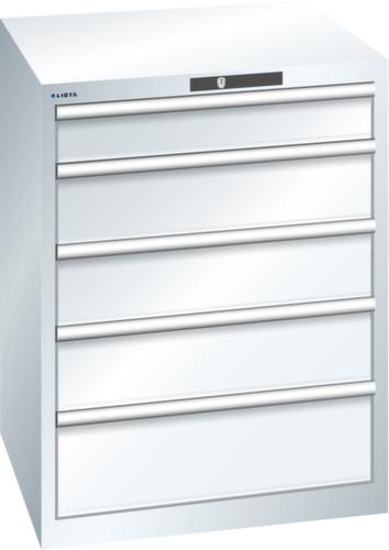 "longDescription": "LISTA Schubladenschrank, Lista Einheit: 36x36E, BxTxH: 717x725x850mm, Schubladen-Nutzfläche BxT: 612x612mm, Anzahl Schubladen: 5, Anzahl Fronthöhen (Tragkraft): 1x100mm (75kg), 3x150mm (75kg), 1x200mm (75kg), Schliessart: Key Lock, Standard-Schliessung mit Wechselyzlinder inkl. 2 Schlüsseln mit Schlüsselnummer, Farbe Gehäuse: Reinweiss RAL 9010, Farbe Schubladen: Reinweiss RAL 9010. Höchste Stabilität: Gehäuse bis 4t belastbar, Schubladen mit 75 oder 200 kg Tragkraft. Maximale Ausnutzung dank Vollauszug und optimaler Mantelhöhe der Schubladen. Exzellente Schutzeigenschaften gegen Schmutz, Flüssigkeiten und mechanische Beanspruchung durch geschlossenes Gehäuse mit schlag- und abriebfester Oberfläche. Überzeugende Sicherheit: Aushebesicherung gegen Herausfallen der Schubladen und Einzelschubladensperre als Kippschutz. Korrosionsschutz durch Elektrophorese-Tauchlackierung und umweltfreundlichen Pulverlack. Optimale Ordnung und Organisation dank speziellem LISTA-Einteilungsmaterial für jeden Zweck und gelochter, geschlitzter Schubladen. Professionelle Beschriftung mit Beschriftungssoftware LISTA Script und hochklappbarer Griffleiste zum Einlegen der Etiketten. Perfekte Laufruhe durch traversenlos geführten Differenzialauszug. Flexible Anpassungsmöglichkeiten durch vorperforierte Löcher für Tischplatten (Punchout), Rollen, Schubladen, Schliesssysteme für einfaches Um- und Nachrüsten<br>",