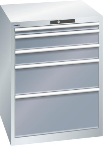 "longDescription": "LISTA Schubladenschrank, Lista Einheit: 36x36E, BxTxH: 717x725x850mm, Schubladen-Nutzfläche BxT: 612x612mm, Anzahl Schubladen: 5, Anzahl Fronthöhen (Tragkraft): 1x 50mm (75kg), 2x100mm (75kg), 1x200mm (75kg), 1x300mm (75kg), Schliessart: Key Lock, Standard-Schliessung mit Wechselyzlinder inkl. 2 Schlüsseln mit Schlüsselnummer, Farbe Gehäuse: Lichtgrau RAL 7035, Farbe Schubladen: Grau metallic NCS S 6502-B. Höchste Stabilität: Gehäuse bis 4t belastbar, Schubladen mit 75 oder 200 kg Tragkraft. Maximale Ausnutzung dank Vollauszug und optimaler Mantelhöhe der Schubladen. Exzellente Schutzeigenschaften gegen Schmutz, Flüssigkeiten und mechanische Beanspruchung durch geschlossenes Gehäuse mit schlag- und abriebfester Oberfläche. Überzeugende Sicherheit: Aushebesicherung gegen Herausfallen der Schubladen und Einzelschubladensperre als Kippschutz. Korrosionsschutz durch Elektrophorese-Tauchlackierung und umweltfreundlichen Pulverlack. Optimale Ordnung und Organisation dank speziellem LISTA-Einteilungsmaterial für jeden Zweck und gelochter, geschlitzter Schubladen. Professionelle Beschriftung mit Beschriftungssoftware LISTA Script und hochklappbarer Griffleiste zum Einlegen der Etiketten. Perfekte Laufruhe durch traversenlos geführten Differenzialauszug. Flexible Anpassungsmöglichkeiten durch vorperforierte Löcher für Tischplatten (Punchout), Rollen, Schubladen, Schliesssysteme für einfaches Um- und Nachrüsten<br>",