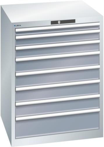 "longDescription": "LISTA Schubladenschrank, Lista Einheit: 36x36E, BxTxH: 717x725x850mm, Schubladen-Nutzfläche BxT: 612x612mm, Anzahl Schubladen: 8, Anzahl Fronthöhen (Tragkraft): 1x 50mm (75kg), 2x 75mm (200kg), 4x100mm (200kg), 1x150mm (200kg), Schliessart: Key Lock, Standard-Schliessung mit Wechselyzlinder inkl. 2 Schlüsseln mit Schlüsselnummer, Farbe Gehäuse: Lichtgrau RAL 7035, Farbe Schubladen: Grau metallic NCS S 6502-B. Höchste Stabilität: Gehäuse bis 4t belastbar, Schubladen mit 75 oder 200 kg Tragkraft. Maximale Ausnutzung dank Vollauszug und optimaler Mantelhöhe der Schubladen. Exzellente Schutzeigenschaften gegen Schmutz, Flüssigkeiten und mechanische Beanspruchung durch geschlossenes Gehäuse mit schlag- und abriebfester Oberfläche. Überzeugende Sicherheit: Aushebesicherung gegen Herausfallen der Schubladen und Einzelschubladensperre als Kippschutz. Korrosionsschutz durch Elektrophorese-Tauchlackierung und umweltfreundlichen Pulverlack. Optimale Ordnung und Organisation dank speziellem LISTA-Einteilungsmaterial für jeden Zweck und gelochter, geschlitzter Schubladen. Professionelle Beschriftung mit Beschriftungssoftware LISTA Script und hochklappbarer Griffleiste zum Einlegen der Etiketten. Perfekte Laufruhe durch traversenlos geführten Differenzialauszug. Flexible Anpassungsmöglichkeiten durch vorperforierte Löcher für Tischplatten (Punchout), Rollen, Schubladen, Schliesssysteme für einfaches Um- und Nachrüsten<br>",