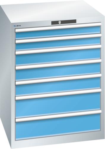 "longDescription": "LISTA Schubladenschrank, Lista Einheit: 36x36E, BxTxH: 717x725x850mm, Schubladen-Nutzfläche BxT: 612x612mm, Anzahl Schubladen: 7, Anzahl Fronthöhen (Tragkraft): 2x 75mm (200kg), 3x100mm (200kg), 2x150mm (200kg), Schliessart: Key Lock, Standard-Schliessung mit Wechselyzlinder inkl. 2 Schlüsseln mit Schlüsselnummer, Farbe Gehäuse: Lichtgrau RAL 7035, Farbe Schubladen: Lichtblau RAL 5012. Höchste Stabilität: Gehäuse bis 4t belastbar, Schubladen mit 75 oder 200 kg Tragkraft. Maximale Ausnutzung dank Vollauszug und optimaler Mantelhöhe der Schubladen. Exzellente Schutzeigenschaften gegen Schmutz, Flüssigkeiten und mechanische Beanspruchung durch geschlossenes Gehäuse mit schlag- und abriebfester Oberfläche. Überzeugende Sicherheit: Aushebesicherung gegen Herausfallen der Schubladen und Einzelschubladensperre als Kippschutz. Korrosionsschutz durch Elektrophorese-Tauchlackierung und umweltfreundlichen Pulverlack. Optimale Ordnung und Organisation dank speziellem LISTA-Einteilungsmaterial für jeden Zweck und gelochter, geschlitzter Schubladen. Professionelle Beschriftung mit Beschriftungssoftware LISTA Script und hochklappbarer Griffleiste zum Einlegen der Etiketten. Perfekte Laufruhe durch traversenlos geführten Differenzialauszug. Flexible Anpassungsmöglichkeiten durch vorperforierte Löcher für Tischplatten (Punchout), Rollen, Schubladen, Schliesssysteme für einfaches Um- und Nachrüsten<br>",