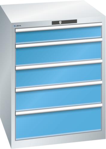 "longDescription": "LISTA Schubladenschrank, Lista Einheit: 36x36E, BxTxH: 717x725x850mm, Schubladen-Nutzfläche BxT: 612x612mm, Anzahl Schubladen: 5, Anzahl Fronthöhen (Tragkraft): 1x100mm (200kg), 3x150mm (200kg), 1x200mm (200kg), Schliessart: Key Lock, Standard-Schliessung mit Wechselyzlinder inkl. 2 Schlüsseln mit Schlüsselnummer, Farbe Gehäuse: Lichtgrau RAL 7035, Farbe Schubladen: Lichtblau RAL 5012. Höchste Stabilität: Gehäuse bis 4t belastbar, Schubladen mit 75 oder 200 kg Tragkraft. Maximale Ausnutzung dank Vollauszug und optimaler Mantelhöhe der Schubladen. Exzellente Schutzeigenschaften gegen Schmutz, Flüssigkeiten und mechanische Beanspruchung durch geschlossenes Gehäuse mit schlag- und abriebfester Oberfläche. Überzeugende Sicherheit: Aushebesicherung gegen Herausfallen der Schubladen und Einzelschubladensperre als Kippschutz. Korrosionsschutz durch Elektrophorese-Tauchlackierung und umweltfreundlichen Pulverlack. Optimale Ordnung und Organisation dank speziellem LISTA-Einteilungsmaterial für jeden Zweck und gelochter, geschlitzter Schubladen. Professionelle Beschriftung mit Beschriftungssoftware LISTA Script und hochklappbarer Griffleiste zum Einlegen der Etiketten. Perfekte Laufruhe durch traversenlos geführten Differenzialauszug. Flexible Anpassungsmöglichkeiten durch vorperforierte Löcher für Tischplatten (Punchout), Rollen, Schubladen, Schliesssysteme für einfaches Um- und Nachrüsten<br>",