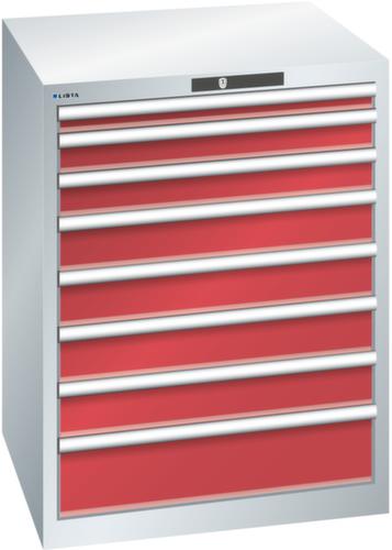 "longDescription": "LISTA Schubladenschrank, Lista Einheit: 36x36E, BxTxH: 717x725x850mm, Schubladen-Nutzfläche BxT: 612x612mm, Anzahl Schubladen: 8, Anzahl Fronthöhen (Tragkraft): 1x 50mm (75kg), 2x 75mm (200kg), 4x100mm (200kg), 1x150mm (200kg), Schliessart: Code Lock, elektronisches Zahlenschloss mit 10 Ziffern für 4- bis 6-stellige Codes, bis 100 Codes, Farbe Gehäuse: Lichtgrau RAL 7035, Farbe Schubladen: Rubinrot RAL 3003. Höchste Stabilität: Gehäuse bis 4t belastbar, Schubladen mit 75 oder 200 kg Tragkraft. Maximale Ausnutzung dank Vollauszug und optimaler Mantelhöhe der Schubladen. Exzellente Schutzeigenschaften gegen Schmutz, Flüssigkeiten und mechanische Beanspruchung durch geschlossenes Gehäuse mit schlag- und abriebfester Oberfläche. Überzeugende Sicherheit: Aushebesicherung gegen Herausfallen der Schubladen und Einzelschubladensperre als Kippschutz. Korrosionsschutz durch Elektrophorese-Tauchlackierung und umweltfreundlichen Pulverlack. Optimale Ordnung und Organisation dank speziellem LISTA-Einteilungsmaterial für jeden Zweck und gelochter, geschlitzter Schubladen. Professionelle Beschriftung mit Beschriftungssoftware LISTA Script und hochklappbarer Griffleiste zum Einlegen der Etiketten. Perfekte Laufruhe durch traversenlos geführten Differenzialauszug. Flexible Anpassungsmöglichkeiten durch vorperforierte Löcher für Tischplatten (Punchout), Rollen, Schubladen, Schliesssysteme für einfaches Um- und Nachrüsten<br>",
