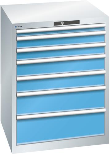 "longDescription": "LISTA Schubladenschrank, Lista Einheit: 36x36E, BxTxH: 717x725x850mm, Schubladen-Nutzfläche BxT: 612x612mm, Anzahl Schubladen: 7, Anzahl Fronthöhen (Tragkraft): 1x50mm (75kg), 2x75mm (200kg), 2x100mm (200kg), 1x150mm (200kg), 1x200mm (200kg), Schliessart: Key Lock, Standard-Schliessung mit Wechselyzlinder inkl. 2 Schlüsseln mit Schlüsselnummer, Farbe Gehäuse: Lichtgrau RAL 7035, Farbe Schubladen: Lichtblau RAL 5012. Höchste Stabilität: Gehäuse bis 4t belastbar, Schubladen mit 75 oder 200 kg Tragkraft. Maximale Ausnutzung dank Vollauszug und optimaler Mantelhöhe der Schubladen. Exzellente Schutzeigenschaften gegen Schmutz, Flüssigkeiten und mechanische Beanspruchung durch geschlossenes Gehäuse mit schlag- und abriebfester Oberfläche. Überzeugende Sicherheit: Aushebesicherung gegen Herausfallen der Schubladen und Einzelschubladensperre als Kippschutz. Korrosionsschutz durch Elektrophorese-Tauchlackierung und umweltfreundlichen Pulverlack. Optimale Ordnung und Organisation dank speziellem LISTA-Einteilungsmaterial für jeden Zweck und gelochter, geschlitzter Schubladen. Professionelle Beschriftung mit Beschriftungssoftware LISTA Script und hochklappbarer Griffleiste zum Einlegen der Etiketten. Perfekte Laufruhe durch traversenlos geführten Differenzialauszug. Flexible Anpassungsmöglichkeiten durch vorperforierte Löcher für Tischplatten (Punchout), Rollen, Schubladen, Schliesssysteme für einfaches Um- und Nachrüsten<br>",