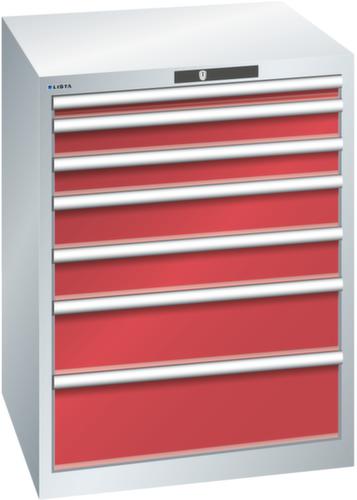 "longDescription": "LISTA Schubladenschrank, Lista Einheit: 36x36E, BxTxH: 717x725x850mm, Schubladen-Nutzfläche BxT: 612x612mm, Anzahl Schubladen: 7, Anzahl Fronthöhen (Tragkraft): 1x50mm (75kg), 2x75mm (200kg), 2x100mm (200kg), 1x150mm (200kg), 1x200mm (200kg), Schliessart: Key Lock, Standard-Schliessung mit Wechselyzlinder inkl. 2 Schlüsseln mit Schlüsselnummer, Farbe Gehäuse: Lichtgrau RAL 7035, Farbe Schubladen: Rubinrot RAL 3003. Höchste Stabilität: Gehäuse bis 4t belastbar, Schubladen mit 75 oder 200 kg Tragkraft. Maximale Ausnutzung dank Vollauszug und optimaler Mantelhöhe der Schubladen. Exzellente Schutzeigenschaften gegen Schmutz, Flüssigkeiten und mechanische Beanspruchung durch geschlossenes Gehäuse mit schlag- und abriebfester Oberfläche. Überzeugende Sicherheit: Aushebesicherung gegen Herausfallen der Schubladen und Einzelschubladensperre als Kippschutz. Korrosionsschutz durch Elektrophorese-Tauchlackierung und umweltfreundlichen Pulverlack. Optimale Ordnung und Organisation dank speziellem LISTA-Einteilungsmaterial für jeden Zweck und gelochter, geschlitzter Schubladen. Professionelle Beschriftung mit Beschriftungssoftware LISTA Script und hochklappbarer Griffleiste zum Einlegen der Etiketten. Perfekte Laufruhe durch traversenlos geführten Differenzialauszug. Flexible Anpassungsmöglichkeiten durch vorperforierte Löcher für Tischplatten (Punchout), Rollen, Schubladen, Schliesssysteme für einfaches Um- und Nachrüsten<br>",