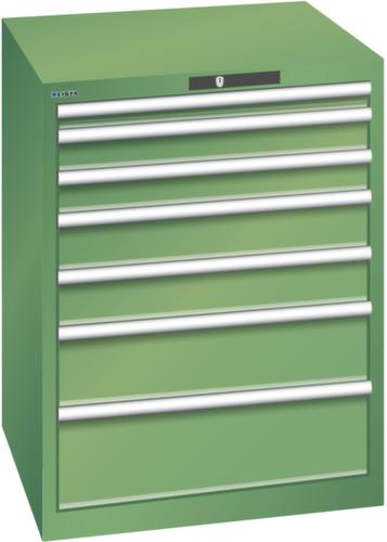 "longDescription": "LISTA Schubladenschrank, Lista Einheit: 36x36E, BxTxH: 717x725x850mm, Schubladen-Nutzfläche BxT: 612x612mm, Anzahl Schubladen: 7, Anzahl Fronthöhen (Tragkraft): 1x50mm (75kg), 2x75mm (200kg), 2x100mm (200kg), 1x150mm (200kg), 1x200mm (200kg), Schliessart: Code Lock, elektronisches Zahlenschloss mit 10 Ziffern für 4- bis 6-stellige Codes, bis 100 Codes, Farbe Gehäuse: Resedagrün RAL 6011, Farbe Schubladen: Resedagrün RAL 6011. Höchste Stabilität: Gehäuse bis 4t belastbar, Schubladen mit 75 oder 200 kg Tragkraft. Maximale Ausnutzung dank Vollauszug und optimaler Mantelhöhe der Schubladen. Exzellente Schutzeigenschaften gegen Schmutz, Flüssigkeiten und mechanische Beanspruchung durch geschlossenes Gehäuse mit schlag- und abriebfester Oberfläche. Überzeugende Sicherheit: Aushebesicherung gegen Herausfallen der Schubladen und Einzelschubladensperre als Kippschutz. Korrosionsschutz durch Elektrophorese-Tauchlackierung und umweltfreundlichen Pulverlack. Optimale Ordnung und Organisation dank speziellem LISTA-Einteilungsmaterial für jeden Zweck und gelochter, geschlitzter Schubladen. Professionelle Beschriftung mit Beschriftungssoftware LISTA Script und hochklappbarer Griffleiste zum Einlegen der Etiketten. Perfekte Laufruhe durch traversenlos geführten Differenzialauszug. Flexible Anpassungsmöglichkeiten durch vorperforierte Löcher für Tischplatten (Punchout), Rollen, Schubladen, Schliesssysteme für einfaches Um- und Nachrüsten<br>",