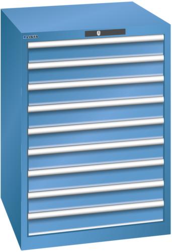 "longDescription": "LISTA Schubladenschrank, Lista Einheit: 36x36E, BxTxH: 717x725x1000mm, Schubladen-Nutzfläche BxT: 612x612mm, Anzahl Schubladen: 9, Anzahl Fronthöhen (Tragkraft): 9x100mm (200kg), Schliessart: Key Lock, Standard-Schliessung mit Wechselyzlinder inkl. 2 Schlüsseln mit Schlüsselnummer, Farbe Gehäuse: Capriblau RAL 5019, Farbe Schubladen: Capriblau RAL 5019. Höchste Stabilität: Gehäuse bis 4t belastbar, Schubladen mit 75 oder 200 kg Tragkraft. Maximale Ausnutzung dank Vollauszug und optimaler Mantelhöhe der Schubladen. Exzellente Schutzeigenschaften gegen Schmutz, Flüssigkeiten und mechanische Beanspruchung durch geschlossenes Gehäuse mit schlag- und abriebfester Oberfläche. Überzeugende Sicherheit: Aushebesicherung gegen Herausfallen der Schubladen und Einzelschubladensperre als Kippschutz. Korrosionsschutz durch Elektrophorese-Tauchlackierung und umweltfreundlichen Pulverlack. Optimale Ordnung und Organisation dank speziellem LISTA-Einteilungsmaterial für jeden Zweck und gelochter, geschlitzter Schubladen. Professionelle Beschriftung mit Beschriftungssoftware LISTA Script und hochklappbarer Griffleiste zum Einlegen der Etiketten. Perfekte Laufruhe durch traversenlos geführten Differenzialauszug. Flexible Anpassungsmöglichkeiten durch vorperforierte Löcher für Tischplatten (Punchout), Rollen, Schubladen, Schliesssysteme für einfaches Um- und Nachrüsten<br>",