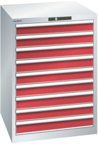 "longDescription": "LISTA Schubladenschrank, Lista Einheit: 36x36E, BxTxH: 717x725x1000mm, Schubladen-Nutzfläche BxT: 612x612mm, Anzahl Schubladen: 9, Anzahl Fronthöhen (Tragkraft): 9x100mm (200kg), Schliessart: Code Lock, elektronisches Zahlenschloss mit 10 Ziffern für 4- bis 6-stellige Codes, bis 100 Codes, Farbe Gehäuse: Lichtgrau RAL 7035, Farbe Schubladen: Rubinrot RAL 3003. Höchste Stabilität: Gehäuse bis 4t belastbar, Schubladen mit 75 oder 200 kg Tragkraft. Maximale Ausnutzung dank Vollauszug und optimaler Mantelhöhe der Schubladen. Exzellente Schutzeigenschaften gegen Schmutz, Flüssigkeiten und mechanische Beanspruchung durch geschlossenes Gehäuse mit schlag- und abriebfester Oberfläche. Überzeugende Sicherheit: Aushebesicherung gegen Herausfallen der Schubladen und Einzelschubladensperre als Kippschutz. Korrosionsschutz durch Elektrophorese-Tauchlackierung und umweltfreundlichen Pulverlack. Optimale Ordnung und Organisation dank speziellem LISTA-Einteilungsmaterial für jeden Zweck und gelochter, geschlitzter Schubladen. Professionelle Beschriftung mit Beschriftungssoftware LISTA Script und hochklappbarer Griffleiste zum Einlegen der Etiketten. Perfekte Laufruhe durch traversenlos geführten Differenzialauszug. Flexible Anpassungsmöglichkeiten durch vorperforierte Löcher für Tischplatten (Punchout), Rollen, Schubladen, Schliesssysteme für einfaches Um- und Nachrüsten<br>",