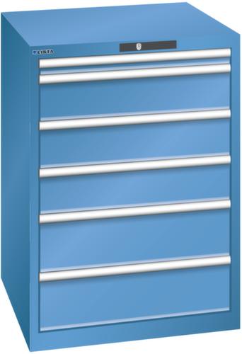 "longDescription": "LISTA Schubladenschrank, Lista Einheit: 36x36E, BxTxH: 717x725x1000mm, Schubladen-Nutzfläche BxT: 612x612mm, Anzahl Schubladen: 6, Anzahl Fronthöhen (Tragkraft): 1x 50mm (75kg), 3x150mm (200kg), 2x200mm (200kg), Schliessart: Key Lock, Standard-Schliessung mit Wechselyzlinder inkl. 2 Schlüsseln mit Schlüsselnummer, Farbe Gehäuse: Capriblau RAL 5019, Farbe Schubladen: Capriblau RAL 5019. Höchste Stabilität: Gehäuse bis 4t belastbar, Schubladen mit 75 oder 200 kg Tragkraft. Maximale Ausnutzung dank Vollauszug und optimaler Mantelhöhe der Schubladen. Exzellente Schutzeigenschaften gegen Schmutz, Flüssigkeiten und mechanische Beanspruchung durch geschlossenes Gehäuse mit schlag- und abriebfester Oberfläche. Überzeugende Sicherheit: Aushebesicherung gegen Herausfallen der Schubladen und Einzelschubladensperre als Kippschutz. Korrosionsschutz durch Elektrophorese-Tauchlackierung und umweltfreundlichen Pulverlack. Optimale Ordnung und Organisation dank speziellem LISTA-Einteilungsmaterial für jeden Zweck und gelochter, geschlitzter Schubladen. Professionelle Beschriftung mit Beschriftungssoftware LISTA Script und hochklappbarer Griffleiste zum Einlegen der Etiketten. Perfekte Laufruhe durch traversenlos geführten Differenzialauszug. Flexible Anpassungsmöglichkeiten durch vorperforierte Löcher für Tischplatten (Punchout), Rollen, Schubladen, Schliesssysteme für einfaches Um- und Nachrüsten<br>",