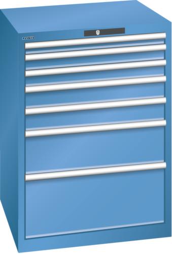 "longDescription": "LISTA Schubladenschrank, Lista Einheit: 36x36E, BxTxH: 717x725x1000mm, Schubladen-Nutzfläche BxT: 612x612mm, Anzahl Schubladen: 7, Anzahl Fronthöhen (Tragkraft): 1x 50mm (75kg), 2x 75mm (75kg), 2x100mm (75kg), 1x200mm (75kg), 1x300mm (75kg), Schliessart: Code Lock, elektronisches Zahlenschloss mit 10 Ziffern für 4- bis 6-stellige Codes, bis 100 Codes, Farbe Gehäuse: Capriblau RAL 5019, Farbe Schubladen: Capriblau RAL 5019. Höchste Stabilität: Gehäuse bis 4t belastbar, Schubladen mit 75 oder 200 kg Tragkraft. Maximale Ausnutzung dank Vollauszug und optimaler Mantelhöhe der Schubladen. Exzellente Schutzeigenschaften gegen Schmutz, Flüssigkeiten und mechanische Beanspruchung durch geschlossenes Gehäuse mit schlag- und abriebfester Oberfläche. Überzeugende Sicherheit: Aushebesicherung gegen Herausfallen der Schubladen und Einzelschubladensperre als Kippschutz. Korrosionsschutz durch Elektrophorese-Tauchlackierung und umweltfreundlichen Pulverlack. Optimale Ordnung und Organisation dank speziellem LISTA-Einteilungsmaterial für jeden Zweck und gelochter, geschlitzter Schubladen. Professionelle Beschriftung mit Beschriftungssoftware LISTA Script und hochklappbarer Griffleiste zum Einlegen der Etiketten. Perfekte Laufruhe durch traversenlos geführten Differenzialauszug. Flexible Anpassungsmöglichkeiten durch vorperforierte Löcher für Tischplatten (Punchout), Rollen, Schubladen, Schliesssysteme für einfaches Um- und Nachrüsten<br>",