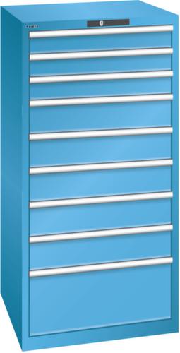 "longDescription": "LISTA Schubladenschrank, Lista Einheit: 36x36E, BxTxH: 717x725x1450mm, Schubladen-Nutzfläche BxT: 612x612mm, Anzahl Schubladen: 9, Anzahl Fronthöhen (Tragkraft): 3x100mm (200kg), 5x150mm (200kg), 1x300mm (200kg), Schliessart: Code Lock, elektronisches Zahlenschloss mit 10 Ziffern für 4- bis 6-stellige Codes, bis 100 Codes, Farbe Gehäuse: Lichtblau RAL 5012, Farbe Schubladen: Lichtblau RAL 5012. Höchste Stabilität: Gehäuse bis 4t belastbar, Schubladen mit 75 oder 200 kg Tragkraft. Maximale Ausnutzung dank Vollauszug und optimaler Mantelhöhe der Schubladen. Exzellente Schutzeigenschaften gegen Schmutz, Flüssigkeiten und mechanische Beanspruchung durch geschlossenes Gehäuse mit schlag- und abriebfester Oberfläche. Überzeugende Sicherheit: Aushebesicherung gegen Herausfallen der Schubladen und Einzelschubladensperre als Kippschutz. Korrosionsschutz durch Elektrophorese-Tauchlackierung und umweltfreundlichen Pulverlack. Optimale Ordnung und Organisation dank speziellem LISTA-Einteilungsmaterial für jeden Zweck und gelochter, geschlitzter Schubladen. Professionelle Beschriftung mit Beschriftungssoftware LISTA Script und hochklappbarer Griffleiste zum Einlegen der Etiketten. Perfekte Laufruhe durch traversenlos geführten Differenzialauszug. Flexible Anpassungsmöglichkeiten durch vorperforierte Löcher für Tischplatten (Punchout), Rollen, Schubladen, Schliesssysteme für einfaches Um- und Nachrüsten<br>",