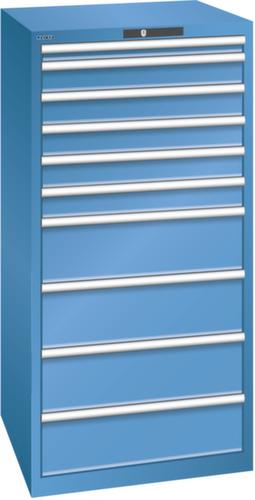 "longDescription": "LISTA Schubladenschrank, Lista Einheit: 36x36E, BxTxH: 717x725x1450mm, Schubladen-Nutzfläche BxT: 612x612mm, Anzahl Schubladen: 10, Anzahl Fronthöhen (Tragkraft): 1x 50mm (75kg), 5x100mm (200kg), 4x200mm (200kg), Schliessart: Code Lock, elektronisches Zahlenschloss mit 10 Ziffern für 4- bis 6-stellige Codes, bis 100 Codes, Farbe Gehäuse: Capriblau RAL 5019, Farbe Schubladen: Capriblau RAL 5019. Höchste Stabilität: Gehäuse bis 4t belastbar, Schubladen mit 75 oder 200 kg Tragkraft. Maximale Ausnutzung dank Vollauszug und optimaler Mantelhöhe der Schubladen. Exzellente Schutzeigenschaften gegen Schmutz, Flüssigkeiten und mechanische Beanspruchung durch geschlossenes Gehäuse mit schlag- und abriebfester Oberfläche. Überzeugende Sicherheit: Aushebesicherung gegen Herausfallen der Schubladen und Einzelschubladensperre als Kippschutz. Korrosionsschutz durch Elektrophorese-Tauchlackierung und umweltfreundlichen Pulverlack. Optimale Ordnung und Organisation dank speziellem LISTA-Einteilungsmaterial für jeden Zweck und gelochter, geschlitzter Schubladen. Professionelle Beschriftung mit Beschriftungssoftware LISTA Script und hochklappbarer Griffleiste zum Einlegen der Etiketten. Perfekte Laufruhe durch traversenlos geführten Differenzialauszug. Flexible Anpassungsmöglichkeiten durch vorperforierte Löcher für Tischplatten (Punchout), Rollen, Schubladen, Schliesssysteme für einfaches Um- und Nachrüsten<br>",