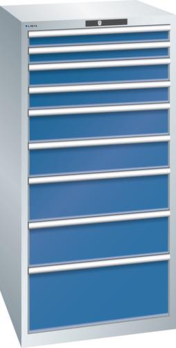 "longDescription": "LISTA Schubladenschrank, Lista Einheit: 36x36E, BxTxH: 717x725x1450mm, Schubladen-Nutzfläche BxT: 612x612mm, Anzahl Schubladen: 9, Anzahl Fronthöhen (Tragkraft): 2x 75mm (75kg), 2x100mm (75kg), 2x150mm (75kg), 2x200mm (75kg), 1x300mm (75kg), Schliessart: Code Lock, elektronisches Zahlenschloss mit 10 Ziffern für 4- bis 6-stellige Codes, bis 100 Codes, Farbe Gehäuse: Lichtgrau RAL 7035, Farbe Schubladen: Signalblau RAL 5005. Höchste Stabilität: Gehäuse bis 4t belastbar, Schubladen mit 75 oder 200 kg Tragkraft. Maximale Ausnutzung dank Vollauszug und optimaler Mantelhöhe der Schubladen. Exzellente Schutzeigenschaften gegen Schmutz, Flüssigkeiten und mechanische Beanspruchung durch geschlossenes Gehäuse mit schlag- und abriebfester Oberfläche. Überzeugende Sicherheit: Aushebesicherung gegen Herausfallen der Schubladen und Einzelschubladensperre als Kippschutz. Korrosionsschutz durch Elektrophorese-Tauchlackierung und umweltfreundlichen Pulverlack. Optimale Ordnung und Organisation dank speziellem LISTA-Einteilungsmaterial für jeden Zweck und gelochter, geschlitzter Schubladen. Professionelle Beschriftung mit Beschriftungssoftware LISTA Script und hochklappbarer Griffleiste zum Einlegen der Etiketten. Perfekte Laufruhe durch traversenlos geführten Differenzialauszug. Flexible Anpassungsmöglichkeiten durch vorperforierte Löcher für Tischplatten (Punchout), Rollen, Schubladen, Schliesssysteme für einfaches Um- und Nachrüsten<br>",