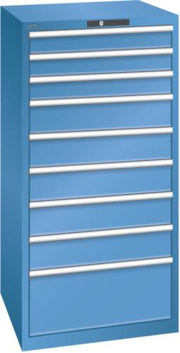 "longDescription": "LISTA Schubladenschrank, Lista Einheit: 36x36E, BxTxH: 717x725x1450mm, Schubladen-Nutzfläche BxT: 612x612mm, Anzahl Schubladen: 9, Anzahl Fronthöhen (Tragkraft): 3x100mm (75kg), 5x150mm (75kg), 1x300mm (75kg), Schliessart: Code Lock, elektronisches Zahlenschloss mit 10 Ziffern für 4- bis 6-stellige Codes, bis 100 Codes, Farbe Gehäuse: Capriblau RAL 5019, Farbe Schubladen: Capriblau RAL 5019. Höchste Stabilität: Gehäuse bis 4t belastbar, Schubladen mit 75 oder 200 kg Tragkraft. Maximale Ausnutzung dank Vollauszug und optimaler Mantelhöhe der Schubladen. Exzellente Schutzeigenschaften gegen Schmutz, Flüssigkeiten und mechanische Beanspruchung durch geschlossenes Gehäuse mit schlag- und abriebfester Oberfläche. Überzeugende Sicherheit: Aushebesicherung gegen Herausfallen der Schubladen und Einzelschubladensperre als Kippschutz. Korrosionsschutz durch Elektrophorese-Tauchlackierung und umweltfreundlichen Pulverlack. Optimale Ordnung und Organisation dank speziellem LISTA-Einteilungsmaterial für jeden Zweck und gelochter, geschlitzter Schubladen. Professionelle Beschriftung mit Beschriftungssoftware LISTA Script und hochklappbarer Griffleiste zum Einlegen der Etiketten. Perfekte Laufruhe durch traversenlos geführten Differenzialauszug. Flexible Anpassungsmöglichkeiten durch vorperforierte Löcher für Tischplatten (Punchout), Rollen, Schubladen, Schliesssysteme für einfaches Um- und Nachrüsten<br>",