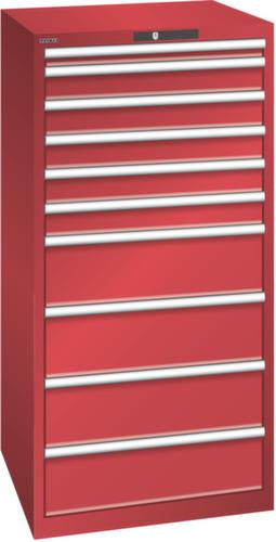 "longDescription": "LISTA Schubladenschrank, Lista Einheit: 36x36E, BxTxH: 717x725x1450mm, Schubladen-Nutzfläche BxT: 612x612mm, Anzahl Schubladen: 10, Anzahl Fronthöhen (Tragkraft): 1x 50mm (75kg), 5x100mm (75kg), 4x200mm (75kg), Schliessart: Code Lock, elektronisches Zahlenschloss mit 10 Ziffern für 4- bis 6-stellige Codes, bis 100 Codes, Farbe Gehäuse: Rubinrot RAL 3003, Farbe Schubladen: Rubinrot RAL 3003. Höchste Stabilität: Gehäuse bis 4t belastbar, Schubladen mit 75 oder 200 kg Tragkraft. Maximale Ausnutzung dank Vollauszug und optimaler Mantelhöhe der Schubladen. Exzellente Schutzeigenschaften gegen Schmutz, Flüssigkeiten und mechanische Beanspruchung durch geschlossenes Gehäuse mit schlag- und abriebfester Oberfläche. Überzeugende Sicherheit: Aushebesicherung gegen Herausfallen der Schubladen und Einzelschubladensperre als Kippschutz. Korrosionsschutz durch Elektrophorese-Tauchlackierung und umweltfreundlichen Pulverlack. Optimale Ordnung und Organisation dank speziellem LISTA-Einteilungsmaterial für jeden Zweck und gelochter, geschlitzter Schubladen. Professionelle Beschriftung mit Beschriftungssoftware LISTA Script und hochklappbarer Griffleiste zum Einlegen der Etiketten. Perfekte Laufruhe durch traversenlos geführten Differenzialauszug. Flexible Anpassungsmöglichkeiten durch vorperforierte Löcher für Tischplatten (Punchout), Rollen, Schubladen, Schliesssysteme für einfaches Um- und Nachrüsten<br>",