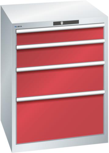 "longDescription": "LISTA Schubladenschrank, Lista Einheit: 36x36E, BxTxH: 717x725x850mm, Schubladen-Nutzfläche BxT: 612x612mm, Anzahl Schubladen: 4, Anzahl Fronthöhen (Tragkraft): 1x100mm (75kg), 1x150mm (75kg), 1x200mm (75kg), 1x300mm (75kg), Schliessart: Key Lock, Standard-Schliessung mit Wechselyzlinder inkl. 2 Schlüsseln mit Schlüsselnummer, Farbe Gehäuse: Lichtgrau RAL 7035, Farbe Schubladen: Rubinrot RAL 3003. Höchste Stabilität: Gehäuse bis 4t belastbar, Schubladen mit 75 oder 200 kg Tragkraft. Maximale Ausnutzung dank Vollauszug und optimaler Mantelhöhe der Schubladen. Exzellente Schutzeigenschaften gegen Schmutz, Flüssigkeiten und mechanische Beanspruchung durch geschlossenes Gehäuse mit schlag- und abriebfester Oberfläche. Überzeugende Sicherheit: Aushebesicherung gegen Herausfallen der Schubladen und Einzelschubladensperre als Kippschutz. Korrosionsschutz durch Elektrophorese-Tauchlackierung und umweltfreundlichen Pulverlack. Optimale Ordnung und Organisation dank speziellem LISTA-Einteilungsmaterial für jeden Zweck und gelochter, geschlitzter Schubladen. Professionelle Beschriftung mit Beschriftungssoftware LISTA Script und hochklappbarer Griffleiste zum Einlegen der Etiketten. Perfekte Laufruhe durch traversenlos geführten Differenzialauszug. Flexible Anpassungsmöglichkeiten durch vorperforierte Löcher für Tischplatten (Punchout), Rollen, Schubladen, Schliesssysteme für einfaches Um- und Nachrüsten<br>",