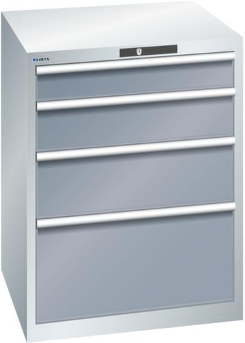 "longDescription": "LISTA Schubladenschrank, Lista Einheit: 36x36E, BxTxH: 717x725x850mm, Schubladen-Nutzfläche BxT: 612x612mm, Anzahl Schubladen: 4, Anzahl Fronthöhen (Tragkraft): 1x100mm (200kg), 1x150mm (200kg), 1x200mm (200kg), 1x300mm (200kg), Schliessart: Key Lock, Standard-Schliessung mit Wechselyzlinder inkl. 2 Schlüsseln mit Schlüsselnummer, Farbe Gehäuse: Lichtgrau RAL 7035, Farbe Schubladen: Grau metallic NCS S 6502-B. Höchste Stabilität: Gehäuse bis 4t belastbar, Schubladen mit 75 oder 200 kg Tragkraft. Maximale Ausnutzung dank Vollauszug und optimaler Mantelhöhe der Schubladen. Exzellente Schutzeigenschaften gegen Schmutz, Flüssigkeiten und mechanische Beanspruchung durch geschlossenes Gehäuse mit schlag- und abriebfester Oberfläche. Überzeugende Sicherheit: Aushebesicherung gegen Herausfallen der Schubladen und Einzelschubladensperre als Kippschutz. Korrosionsschutz durch Elektrophorese-Tauchlackierung und umweltfreundlichen Pulverlack. Optimale Ordnung und Organisation dank speziellem LISTA-Einteilungsmaterial für jeden Zweck und gelochter, geschlitzter Schubladen. Professionelle Beschriftung mit Beschriftungssoftware LISTA Script und hochklappbarer Griffleiste zum Einlegen der Etiketten. Perfekte Laufruhe durch traversenlos geführten Differenzialauszug. Flexible Anpassungsmöglichkeiten durch vorperforierte Löcher für Tischplatten (Punchout), Rollen, Schubladen, Schliesssysteme für einfaches Um- und Nachrüsten<br>",