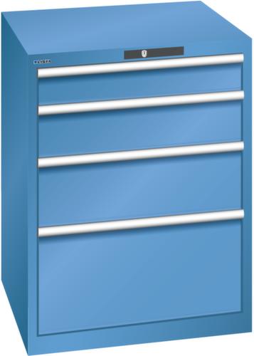 "longDescription": "LISTA Schubladenschrank, Lista Einheit: 36x36E, BxTxH: 717x725x850mm, Schubladen-Nutzfläche BxT: 612x612mm, Anzahl Schubladen: 4, Anzahl Fronthöhen (Tragkraft): 1x100mm (200kg), 1x150mm (200kg), 1x200mm (200kg), 1x300mm (200kg), Schliessart: Code Lock, elektronisches Zahlenschloss mit 10 Ziffern für 4- bis 6-stellige Codes, bis 100 Codes, Farbe Gehäuse: Capriblau RAL 5019, Farbe Schubladen: Capriblau RAL 5019. Höchste Stabilität: Gehäuse bis 4t belastbar, Schubladen mit 75 oder 200 kg Tragkraft. Maximale Ausnutzung dank Vollauszug und optimaler Mantelhöhe der Schubladen. Exzellente Schutzeigenschaften gegen Schmutz, Flüssigkeiten und mechanische Beanspruchung durch geschlossenes Gehäuse mit schlag- und abriebfester Oberfläche. Überzeugende Sicherheit: Aushebesicherung gegen Herausfallen der Schubladen und Einzelschubladensperre als Kippschutz. Korrosionsschutz durch Elektrophorese-Tauchlackierung und umweltfreundlichen Pulverlack. Optimale Ordnung und Organisation dank speziellem LISTA-Einteilungsmaterial für jeden Zweck und gelochter, geschlitzter Schubladen. Professionelle Beschriftung mit Beschriftungssoftware LISTA Script und hochklappbarer Griffleiste zum Einlegen der Etiketten. Perfekte Laufruhe durch traversenlos geführten Differenzialauszug. Flexible Anpassungsmöglichkeiten durch vorperforierte Löcher für Tischplatten (Punchout), Rollen, Schubladen, Schliesssysteme für einfaches Um- und Nachrüsten<br>",