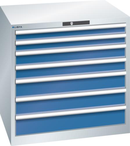 "longDescription": "LISTA Schubladenschrank, Lista Einheit: 45x36E, BxTxH: 870x725x850mm, Schubladen-Nutzfläche BxT: 765x612mm, Anzahl Schubladen: 7, Anzahl Fronthöhen (Tragkraft): 2x75mm (200kg), 2x100mm (200kg), 2x125mm (200kg), 1x150mm (200kg), Schliessart: Key Lock, Standard-Schliessung mit Wechselyzlinder inkl. 2 Schlüsseln mit Schlüsselnummer, Farbe Gehäuse: Lichtgrau RAL 7035, Farbe Schubladen: Signalblau RAL 5005. Höchste Stabilität: Gehäuse bis 4t belastbar, Schubladen mit 75 oder 200 kg Tragkraft. Maximale Ausnutzung dank Vollauszug und optimaler Mantelhöhe der Schubladen. Exzellente Schutzeigenschaften gegen Schmutz, Flüssigkeiten und mechanische Beanspruchung durch geschlossenes Gehäuse mit schlag- und abriebfester Oberfläche. Überzeugende Sicherheit: Aushebesicherung gegen Herausfallen der Schubladen und Einzelschubladensperre als Kippschutz. Korrosionsschutz durch Elektrophorese-Tauchlackierung und umweltfreundlichen Pulverlack. Optimale Ordnung und Organisation dank speziellem LISTA-Einteilungsmaterial für jeden Zweck und gelochter, geschlitzter Schubladen. Professionelle Beschriftung mit Beschriftungssoftware LISTA Script und hochklappbarer Griffleiste zum Einlegen der Etiketten. Perfekte Laufruhe durch traversenlos geführten Differenzialauszug. Flexible Anpassungsmöglichkeiten durch vorperforierte Löcher für Tischplatten (Punchout), Rollen, Schubladen, Schliesssysteme für einfaches Um- und Nachrüsten<br>",