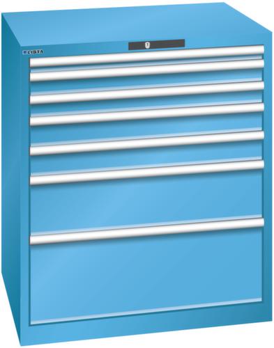 "longDescription": "LISTA Schubladenschrank, Lista Einheit: 45x36E, BxTxH: 870x725x1000mm, Schubladen-Nutzfläche BxT: 765x612mm, Anzahl Schubladen: 7, Anzahl Fronthöhen (Tragkraft): 1x50mm (75kg), 2x75mm (200kg), 2x100mm (200kg), 1x200mm (200kg), 1x300mm (200kg), Schliessart: Key Lock, Standard-Schliessung mit Wechselyzlinder inkl. 2 Schlüsseln mit Schlüsselnummer, Farbe Gehäuse: Lichtblau RAL 5012, Farbe Schubladen: Lichtblau RAL 5012. Höchste Stabilität: Gehäuse bis 4t belastbar, Schubladen mit 75 oder 200 kg Tragkraft. Maximale Ausnutzung dank Vollauszug und optimaler Mantelhöhe der Schubladen. Exzellente Schutzeigenschaften gegen Schmutz, Flüssigkeiten und mechanische Beanspruchung durch geschlossenes Gehäuse mit schlag- und abriebfester Oberfläche. Überzeugende Sicherheit: Aushebesicherung gegen Herausfallen der Schubladen und Einzelschubladensperre als Kippschutz. Korrosionsschutz durch Elektrophorese-Tauchlackierung und umweltfreundlichen Pulverlack. Optimale Ordnung und Organisation dank speziellem LISTA-Einteilungsmaterial für jeden Zweck und gelochter, geschlitzter Schubladen. Professionelle Beschriftung mit Beschriftungssoftware LISTA Script und hochklappbarer Griffleiste zum Einlegen der Etiketten. Perfekte Laufruhe durch traversenlos geführten Differenzialauszug. Flexible Anpassungsmöglichkeiten durch vorperforierte Löcher für Tischplatten (Punchout), Rollen, Schubladen, Schliesssysteme für einfaches Um- und Nachrüsten<br>",
