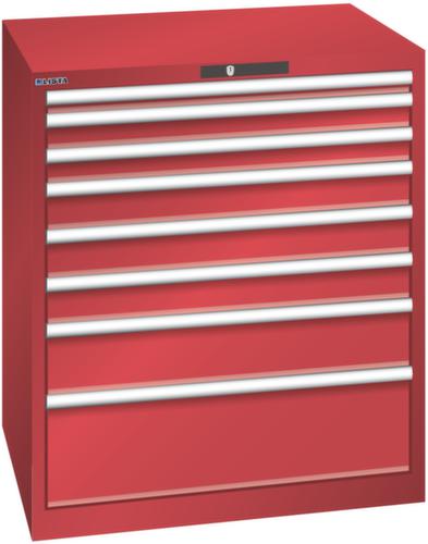"longDescription": "LISTA Schubladenschrank, Lista Einheit: 45x36E, BxTxH: 870x725x1000mm, Schubladen-Nutzfläche BxT: 765x612mm, Anzahl Schubladen: 8, Anzahl Fronthöhen (Tragkraft): 1x50mm (75kg), 2x75mm (75kg), 3x100mm (75kg), 1x150mm (75kg), 1x250mm (200kg), Schliessart: Code Lock, elektronisches Zahlenschloss mit 10 Ziffern für 4- bis 6-stellige Codes, bis 100 Codes, Farbe Gehäuse: Rubinrot RAL 3003, Farbe Schubladen: Rubinrot RAL 3003. Höchste Stabilität: Gehäuse bis 4t belastbar, Schubladen mit 75 oder 200 kg Tragkraft. Maximale Ausnutzung dank Vollauszug und optimaler Mantelhöhe der Schubladen. Exzellente Schutzeigenschaften gegen Schmutz, Flüssigkeiten und mechanische Beanspruchung durch geschlossenes Gehäuse mit schlag- und abriebfester Oberfläche. Überzeugende Sicherheit: Aushebesicherung gegen Herausfallen der Schubladen und Einzelschubladensperre als Kippschutz. Korrosionsschutz durch Elektrophorese-Tauchlackierung und umweltfreundlichen Pulverlack. Optimale Ordnung und Organisation dank speziellem LISTA-Einteilungsmaterial für jeden Zweck und gelochter, geschlitzter Schubladen. Professionelle Beschriftung mit Beschriftungssoftware LISTA Script und hochklappbarer Griffleiste zum Einlegen der Etiketten. Perfekte Laufruhe durch traversenlos geführten Differenzialauszug. Flexible Anpassungsmöglichkeiten durch vorperforierte Löcher für Tischplatten (Punchout), Rollen, Schubladen, Schliesssysteme für einfaches Um- und Nachrüsten<br>",