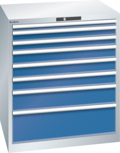"longDescription": "LISTA Schubladenschrank, Lista Einheit: 45x36E, BxTxH: 870x725x1000mm, Schubladen-Nutzfläche BxT: 765x612mm, Anzahl Schubladen: 8, Anzahl Fronthöhen (Tragkraft): 1x50mm (75kg), 2x75mm (75kg), 3x100mm (75kg), 1x150mm (75kg), 1x250mm (200kg), Schliessart: Code Lock, elektronisches Zahlenschloss mit 10 Ziffern für 4- bis 6-stellige Codes, bis 100 Codes, Farbe Gehäuse: Lichtgrau RAL 7035, Farbe Schubladen: Signalblau RAL 5005. Höchste Stabilität: Gehäuse bis 4t belastbar, Schubladen mit 75 oder 200 kg Tragkraft. Maximale Ausnutzung dank Vollauszug und optimaler Mantelhöhe der Schubladen. Exzellente Schutzeigenschaften gegen Schmutz, Flüssigkeiten und mechanische Beanspruchung durch geschlossenes Gehäuse mit schlag- und abriebfester Oberfläche. Überzeugende Sicherheit: Aushebesicherung gegen Herausfallen der Schubladen und Einzelschubladensperre als Kippschutz. Korrosionsschutz durch Elektrophorese-Tauchlackierung und umweltfreundlichen Pulverlack. Optimale Ordnung und Organisation dank speziellem LISTA-Einteilungsmaterial für jeden Zweck und gelochter, geschlitzter Schubladen. Professionelle Beschriftung mit Beschriftungssoftware LISTA Script und hochklappbarer Griffleiste zum Einlegen der Etiketten. Perfekte Laufruhe durch traversenlos geführten Differenzialauszug. Flexible Anpassungsmöglichkeiten durch vorperforierte Löcher für Tischplatten (Punchout), Rollen, Schubladen, Schliesssysteme für einfaches Um- und Nachrüsten<br>",