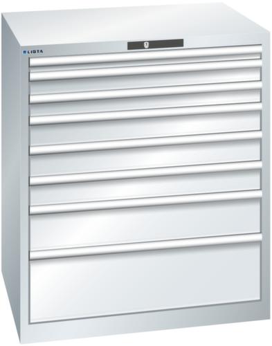 "longDescription": "LISTA Schubladenschrank, Lista Einheit: 45x36E, BxTxH: 870x725x1000mm, Schubladen-Nutzfläche BxT: 765x612mm, Anzahl Schubladen: 8, Anzahl Fronthöhen (Tragkraft): 1x50mm (75kg), 2x75mm (200kg), 3x100mm (200kg), 1x150mm (200kg), 1x250mm (200kg), Schliessart: Code Lock, elektronisches Zahlenschloss mit 10 Ziffern für 4- bis 6-stellige Codes, bis 100 Codes, Farbe Gehäuse: Lichtgrau RAL 7035, Farbe Schubladen: Lichtgrau RAL 7035. Höchste Stabilität: Gehäuse bis 4t belastbar, Schubladen mit 75 oder 200 kg Tragkraft. Maximale Ausnutzung dank Vollauszug und optimaler Mantelhöhe der Schubladen. Exzellente Schutzeigenschaften gegen Schmutz, Flüssigkeiten und mechanische Beanspruchung durch geschlossenes Gehäuse mit schlag- und abriebfester Oberfläche. Überzeugende Sicherheit: Aushebesicherung gegen Herausfallen der Schubladen und Einzelschubladensperre als Kippschutz. Korrosionsschutz durch Elektrophorese-Tauchlackierung und umweltfreundlichen Pulverlack. Optimale Ordnung und Organisation dank speziellem LISTA-Einteilungsmaterial für jeden Zweck und gelochter, geschlitzter Schubladen. Professionelle Beschriftung mit Beschriftungssoftware LISTA Script und hochklappbarer Griffleiste zum Einlegen der Etiketten. Perfekte Laufruhe durch traversenlos geführten Differenzialauszug. Flexible Anpassungsmöglichkeiten durch vorperforierte Löcher für Tischplatten (Punchout), Rollen, Schubladen, Schliesssysteme für einfaches Um- und Nachrüsten<br>",