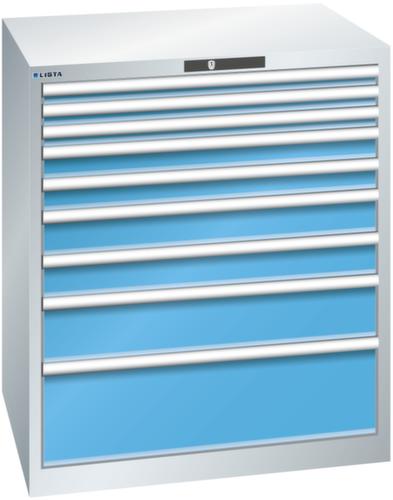 "longDescription": "LISTA Schubladenschrank, Lista Einheit: 45x36E, BxTxH: 870x725x1000mm, Schubladen-Nutzfläche BxT: 765x612mm, Anzahl Schubladen: 9, Anzahl Fronthöhen (Tragkraft): 3x50mm (75kg), 2x75mm (75kg), 2x100mm (75kg), 1x150mm (75kg), 1x250mm (200kg), Schliessart: Code Lock, elektronisches Zahlenschloss mit 10 Ziffern für 4- bis 6-stellige Codes, bis 100 Codes, Farbe Gehäuse: Lichtgrau RAL 7035, Farbe Schubladen: Lichtblau RAL 5012. Höchste Stabilität: Gehäuse bis 4t belastbar, Schubladen mit 75 oder 200 kg Tragkraft. Maximale Ausnutzung dank Vollauszug und optimaler Mantelhöhe der Schubladen. Exzellente Schutzeigenschaften gegen Schmutz, Flüssigkeiten und mechanische Beanspruchung durch geschlossenes Gehäuse mit schlag- und abriebfester Oberfläche. Überzeugende Sicherheit: Aushebesicherung gegen Herausfallen der Schubladen und Einzelschubladensperre als Kippschutz. Korrosionsschutz durch Elektrophorese-Tauchlackierung und umweltfreundlichen Pulverlack. Optimale Ordnung und Organisation dank speziellem LISTA-Einteilungsmaterial für jeden Zweck und gelochter, geschlitzter Schubladen. Professionelle Beschriftung mit Beschriftungssoftware LISTA Script und hochklappbarer Griffleiste zum Einlegen der Etiketten. Perfekte Laufruhe durch traversenlos geführten Differenzialauszug. Flexible Anpassungsmöglichkeiten durch vorperforierte Löcher für Tischplatten (Punchout), Rollen, Schubladen, Schliesssysteme für einfaches Um- und Nachrüsten<br>",