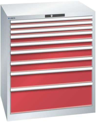 "longDescription": "LISTA Schubladenschrank, Lista Einheit: 45x36E, BxTxH: 870x725x1000mm, Schubladen-Nutzfläche BxT: 765x612mm, Anzahl Schubladen: 9, Anzahl Fronthöhen (Tragkraft): 3x50mm (75kg), 2x75mm (75kg), 2x100mm (75kg), 1x150mm (75kg), 1x250mm (200kg), Schliessart: Code Lock, elektronisches Zahlenschloss mit 10 Ziffern für 4- bis 6-stellige Codes, bis 100 Codes, Farbe Gehäuse: Lichtgrau RAL 7035, Farbe Schubladen: Rubinrot RAL 3003. Höchste Stabilität: Gehäuse bis 4t belastbar, Schubladen mit 75 oder 200 kg Tragkraft. Maximale Ausnutzung dank Vollauszug und optimaler Mantelhöhe der Schubladen. Exzellente Schutzeigenschaften gegen Schmutz, Flüssigkeiten und mechanische Beanspruchung durch geschlossenes Gehäuse mit schlag- und abriebfester Oberfläche. Überzeugende Sicherheit: Aushebesicherung gegen Herausfallen der Schubladen und Einzelschubladensperre als Kippschutz. Korrosionsschutz durch Elektrophorese-Tauchlackierung und umweltfreundlichen Pulverlack. Optimale Ordnung und Organisation dank speziellem LISTA-Einteilungsmaterial für jeden Zweck und gelochter, geschlitzter Schubladen. Professionelle Beschriftung mit Beschriftungssoftware LISTA Script und hochklappbarer Griffleiste zum Einlegen der Etiketten. Perfekte Laufruhe durch traversenlos geführten Differenzialauszug. Flexible Anpassungsmöglichkeiten durch vorperforierte Löcher für Tischplatten (Punchout), Rollen, Schubladen, Schliesssysteme für einfaches Um- und Nachrüsten<br>",