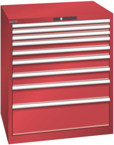 "longDescription": "LISTA Schubladenschrank, Lista Einheit: 45x36E, BxTxH: 870x725x1000mm, Schubladen-Nutzfläche BxT: 765x612mm, Anzahl Schubladen: 9, Anzahl Fronthöhen (Tragkraft): 3x50mm (75kg), 2x75mm (200kg), 2x100mm (200kg), 1x150mm (200kg), 1x250mm (200kg), Schliessart: Key Lock, Standard-Schliessung mit Wechselyzlinder inkl. 2 Schlüsseln mit Schlüsselnummer, Farbe Gehäuse: Rubinrot RAL 3003, Farbe Schubladen: Rubinrot RAL 3003. Höchste Stabilität: Gehäuse bis 4t belastbar, Schubladen mit 75 oder 200 kg Tragkraft. Maximale Ausnutzung dank Vollauszug und optimaler Mantelhöhe der Schubladen. Exzellente Schutzeigenschaften gegen Schmutz, Flüssigkeiten und mechanische Beanspruchung durch geschlossenes Gehäuse mit schlag- und abriebfester Oberfläche. Überzeugende Sicherheit: Aushebesicherung gegen Herausfallen der Schubladen und Einzelschubladensperre als Kippschutz. Korrosionsschutz durch Elektrophorese-Tauchlackierung und umweltfreundlichen Pulverlack. Optimale Ordnung und Organisation dank speziellem LISTA-Einteilungsmaterial für jeden Zweck und gelochter, geschlitzter Schubladen. Professionelle Beschriftung mit Beschriftungssoftware LISTA Script und hochklappbarer Griffleiste zum Einlegen der Etiketten. Perfekte Laufruhe durch traversenlos geführten Differenzialauszug. Flexible Anpassungsmöglichkeiten durch vorperforierte Löcher für Tischplatten (Punchout), Rollen, Schubladen, Schliesssysteme für einfaches Um- und Nachrüsten<br>",