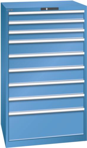 "longDescription": "LISTA Schubladenschrank, Lista Einheit: 45x36E, BxTxH: 870x725x1450mm, Schubladen-Nutzfläche BxT: 765x612mm, Anzahl Schubladen: 9, Anzahl Fronthöhen (Tragkraft): 3x100mm (75kg), 5x150mm (75kg), 1x300mm (200kg), Schliessart: Key Lock, Standard-Schliessung mit Wechselyzlinder inkl. 2 Schlüsseln mit Schlüsselnummer, Farbe Gehäuse: Capriblau RAL 5019, Farbe Schubladen: Capriblau RAL 5019. Höchste Stabilität: Gehäuse bis 4t belastbar, Schubladen mit 75 oder 200 kg Tragkraft. Maximale Ausnutzung dank Vollauszug und optimaler Mantelhöhe der Schubladen. Exzellente Schutzeigenschaften gegen Schmutz, Flüssigkeiten und mechanische Beanspruchung durch geschlossenes Gehäuse mit schlag- und abriebfester Oberfläche. Überzeugende Sicherheit: Aushebesicherung gegen Herausfallen der Schubladen und Einzelschubladensperre als Kippschutz. Korrosionsschutz durch Elektrophorese-Tauchlackierung und umweltfreundlichen Pulverlack. Optimale Ordnung und Organisation dank speziellem LISTA-Einteilungsmaterial für jeden Zweck und gelochter, geschlitzter Schubladen. Professionelle Beschriftung mit Beschriftungssoftware LISTA Script und hochklappbarer Griffleiste zum Einlegen der Etiketten. Perfekte Laufruhe durch traversenlos geführten Differenzialauszug. Flexible Anpassungsmöglichkeiten durch vorperforierte Löcher für Tischplatten (Punchout), Rollen, Schubladen, Schliesssysteme für einfaches Um- und Nachrüsten<br>",