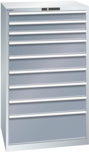 "longDescription": "LISTA Schubladenschrank, Lista Einheit: 45x36E, BxTxH: 870x725x1450mm, Schubladen-Nutzfläche BxT: 765x612mm, Anzahl Schubladen: 9, Anzahl Fronthöhen (Tragkraft): 3x100mm (200kg), 5x150mm (200kg), 1x300mm (200kg), Schliessart: Key Lock, Standard-Schliessung mit Wechselyzlinder inkl. 2 Schlüsseln mit Schlüsselnummer, Farbe Gehäuse: Lichtgrau RAL 7035, Farbe Schubladen: Grau metallic NCS S 6502-B. Höchste Stabilität: Gehäuse bis 4t belastbar, Schubladen mit 75 oder 200 kg Tragkraft. Maximale Ausnutzung dank Vollauszug und optimaler Mantelhöhe der Schubladen. Exzellente Schutzeigenschaften gegen Schmutz, Flüssigkeiten und mechanische Beanspruchung durch geschlossenes Gehäuse mit schlag- und abriebfester Oberfläche. Überzeugende Sicherheit: Aushebesicherung gegen Herausfallen der Schubladen und Einzelschubladensperre als Kippschutz. Korrosionsschutz durch Elektrophorese-Tauchlackierung und umweltfreundlichen Pulverlack. Optimale Ordnung und Organisation dank speziellem LISTA-Einteilungsmaterial für jeden Zweck und gelochter, geschlitzter Schubladen. Professionelle Beschriftung mit Beschriftungssoftware LISTA Script und hochklappbarer Griffleiste zum Einlegen der Etiketten. Perfekte Laufruhe durch traversenlos geführten Differenzialauszug. Flexible Anpassungsmöglichkeiten durch vorperforierte Löcher für Tischplatten (Punchout), Rollen, Schubladen, Schliesssysteme für einfaches Um- und Nachrüsten<br>",