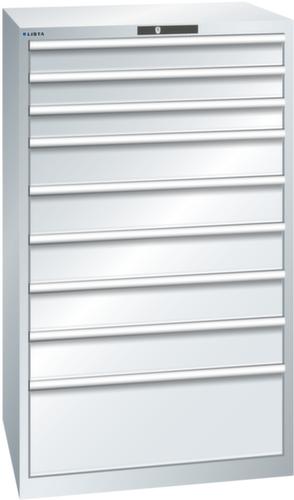 "longDescription": "LISTA Schubladenschrank, Lista Einheit: 45x36E, BxTxH: 870x725x1450mm, Schubladen-Nutzfläche BxT: 765x612mm, Anzahl Schubladen: 9, Anzahl Fronthöhen (Tragkraft): 3x100mm (200kg), 5x150mm (200kg), 1x300mm (200kg), Schliessart: Code Lock, elektronisches Zahlenschloss mit 10 Ziffern für 4- bis 6-stellige Codes, bis 100 Codes, Farbe Gehäuse: Lichtgrau RAL 7035, Farbe Schubladen: Lichtgrau RAL 7035. Höchste Stabilität: Gehäuse bis 4t belastbar, Schubladen mit 75 oder 200 kg Tragkraft. Maximale Ausnutzung dank Vollauszug und optimaler Mantelhöhe der Schubladen. Exzellente Schutzeigenschaften gegen Schmutz, Flüssigkeiten und mechanische Beanspruchung durch geschlossenes Gehäuse mit schlag- und abriebfester Oberfläche. Überzeugende Sicherheit: Aushebesicherung gegen Herausfallen der Schubladen und Einzelschubladensperre als Kippschutz. Korrosionsschutz durch Elektrophorese-Tauchlackierung und umweltfreundlichen Pulverlack. Optimale Ordnung und Organisation dank speziellem LISTA-Einteilungsmaterial für jeden Zweck und gelochter, geschlitzter Schubladen. Professionelle Beschriftung mit Beschriftungssoftware LISTA Script und hochklappbarer Griffleiste zum Einlegen der Etiketten. Perfekte Laufruhe durch traversenlos geführten Differenzialauszug. Flexible Anpassungsmöglichkeiten durch vorperforierte Löcher für Tischplatten (Punchout), Rollen, Schubladen, Schliesssysteme für einfaches Um- und Nachrüsten<br>",