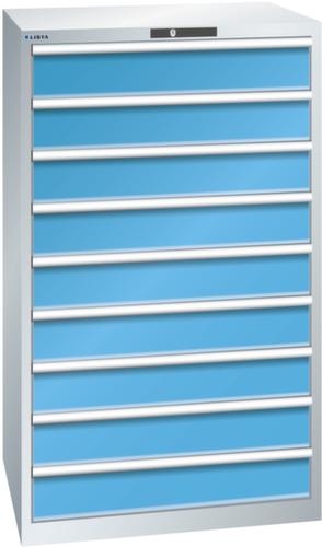 "longDescription": "LISTA Schubladenschrank, Lista Einheit: 45x36E, BxTxH: 870x725x1450mm, Schubladen-Nutzfläche BxT: 765x612mm, Anzahl Schubladen: 9, Anzahl Fronthöhen (Tragkraft): 9x150mm (75kg), Schliessart: Key Lock, Standard-Schliessung mit Wechselyzlinder inkl. 2 Schlüsseln mit Schlüsselnummer, Farbe Gehäuse: Lichtgrau RAL 7035, Farbe Schubladen: Lichtblau RAL 5012. Höchste Stabilität: Gehäuse bis 4t belastbar, Schubladen mit 75 oder 200 kg Tragkraft. Maximale Ausnutzung dank Vollauszug und optimaler Mantelhöhe der Schubladen. Exzellente Schutzeigenschaften gegen Schmutz, Flüssigkeiten und mechanische Beanspruchung durch geschlossenes Gehäuse mit schlag- und abriebfester Oberfläche. Überzeugende Sicherheit: Aushebesicherung gegen Herausfallen der Schubladen und Einzelschubladensperre als Kippschutz. Korrosionsschutz durch Elektrophorese-Tauchlackierung und umweltfreundlichen Pulverlack. Optimale Ordnung und Organisation dank speziellem LISTA-Einteilungsmaterial für jeden Zweck und gelochter, geschlitzter Schubladen. Professionelle Beschriftung mit Beschriftungssoftware LISTA Script und hochklappbarer Griffleiste zum Einlegen der Etiketten. Perfekte Laufruhe durch traversenlos geführten Differenzialauszug. Flexible Anpassungsmöglichkeiten durch vorperforierte Löcher für Tischplatten (Punchout), Rollen, Schubladen, Schliesssysteme für einfaches Um- und Nachrüsten<br>",