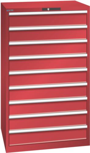 "longDescription": "LISTA Schubladenschrank, Lista Einheit: 45x36E, BxTxH: 870x725x1450mm, Schubladen-Nutzfläche BxT: 765x612mm, Anzahl Schubladen: 9, Anzahl Fronthöhen (Tragkraft): 9x150mm (200kg), Schliessart: Code Lock, elektronisches Zahlenschloss mit 10 Ziffern für 4- bis 6-stellige Codes, bis 100 Codes, Farbe Gehäuse: Rubinrot RAL 3003, Farbe Schubladen: Rubinrot RAL 3003. Höchste Stabilität: Gehäuse bis 4t belastbar, Schubladen mit 75 oder 200 kg Tragkraft. Maximale Ausnutzung dank Vollauszug und optimaler Mantelhöhe der Schubladen. Exzellente Schutzeigenschaften gegen Schmutz, Flüssigkeiten und mechanische Beanspruchung durch geschlossenes Gehäuse mit schlag- und abriebfester Oberfläche. Überzeugende Sicherheit: Aushebesicherung gegen Herausfallen der Schubladen und Einzelschubladensperre als Kippschutz. Korrosionsschutz durch Elektrophorese-Tauchlackierung und umweltfreundlichen Pulverlack. Optimale Ordnung und Organisation dank speziellem LISTA-Einteilungsmaterial für jeden Zweck und gelochter, geschlitzter Schubladen. Professionelle Beschriftung mit Beschriftungssoftware LISTA Script und hochklappbarer Griffleiste zum Einlegen der Etiketten. Perfekte Laufruhe durch traversenlos geführten Differenzialauszug. Flexible Anpassungsmöglichkeiten durch vorperforierte Löcher für Tischplatten (Punchout), Rollen, Schubladen, Schliesssysteme für einfaches Um- und Nachrüsten<br>",