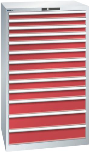 "longDescription": "LISTA Schubladenschrank, Lista Einheit: 45x36E, BxTxH: 870x725x1450mm, Schubladen-Nutzfläche BxT: 765x612mm, Anzahl Schubladen: 13, Anzahl Fronthöhen (Tragkraft): 4x75mm (75kg), 6x100mm (75kg), 3x150mm (75kg), Schliessart: Key Lock, Standard-Schliessung mit Wechselyzlinder inkl. 2 Schlüsseln mit Schlüsselnummer, Farbe Gehäuse: Lichtgrau RAL 7035, Farbe Schubladen: Rubinrot RAL 3003. Höchste Stabilität: Gehäuse bis 4t belastbar, Schubladen mit 75 oder 200 kg Tragkraft. Maximale Ausnutzung dank Vollauszug und optimaler Mantelhöhe der Schubladen. Exzellente Schutzeigenschaften gegen Schmutz, Flüssigkeiten und mechanische Beanspruchung durch geschlossenes Gehäuse mit schlag- und abriebfester Oberfläche. Überzeugende Sicherheit: Aushebesicherung gegen Herausfallen der Schubladen und Einzelschubladensperre als Kippschutz. Korrosionsschutz durch Elektrophorese-Tauchlackierung und umweltfreundlichen Pulverlack. Optimale Ordnung und Organisation dank speziellem LISTA-Einteilungsmaterial für jeden Zweck und gelochter, geschlitzter Schubladen. Professionelle Beschriftung mit Beschriftungssoftware LISTA Script und hochklappbarer Griffleiste zum Einlegen der Etiketten. Perfekte Laufruhe durch traversenlos geführten Differenzialauszug. Flexible Anpassungsmöglichkeiten durch vorperforierte Löcher für Tischplatten (Punchout), Rollen, Schubladen, Schliesssysteme für einfaches Um- und Nachrüsten<br>",