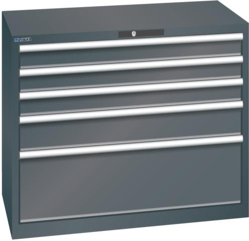 "longDescription": "LISTA Schubladenschrank, Lista Einheit: 54x27E, BxTxH: 1023x572x850mm, Schubladen-Nutzfläche BxT: 918x459mm, Anzahl Schubladen: 5, Anzahl Fronthöhen (Tragkraft): 3x100mm (200kg), 1x150mm (200kg), 1x300mm (200kg), Schliessart: Code Lock, elektronisches Zahlenschloss mit 10 Ziffern für 4- bis 6-stellige Codes, bis 100 Codes, Farbe Gehäuse: Schwarz NCS S 9000-N, Farbe Schubladen: Schwarz NCS S 9000-N. Höchste Stabilität: Gehäuse bis 4t belastbar, Schubladen mit 75 oder 200 kg Tragkraft. Maximale Ausnutzung dank Vollauszug und optimaler Mantelhöhe der Schubladen. Exzellente Schutzeigenschaften gegen Schmutz, Flüssigkeiten und mechanische Beanspruchung durch geschlossenes Gehäuse mit schlag- und abriebfester Oberfläche. Überzeugende Sicherheit: Aushebesicherung gegen Herausfallen der Schubladen und Einzelschubladensperre als Kippschutz. Korrosionsschutz durch Elektrophorese-Tauchlackierung und umweltfreundlichen Pulverlack. Optimale Ordnung und Organisation dank speziellem LISTA-Einteilungsmaterial für jeden Zweck und gelochter, geschlitzter Schubladen. Professionelle Beschriftung mit Beschriftungssoftware LISTA Script und hochklappbarer Griffleiste zum Einlegen der Etiketten. Perfekte Laufruhe durch traversenlos geführten Differenzialauszug. Flexible Anpassungsmöglichkeiten durch vorperforierte Löcher für Tischplatten (Punchout), Rollen, Schubladen, Schliesssysteme für einfaches Um- und Nachrüsten<br>",