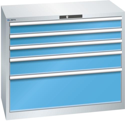 "longDescription": "LISTA Schubladenschrank, Lista Einheit: 54x27E, BxTxH: 1023x572x850mm, Schubladen-Nutzfläche BxT: 918x459mm, Anzahl Schubladen: 5, Anzahl Fronthöhen (Tragkraft): 3x100mm (200kg), 1x150mm (200kg), 1x300mm (200kg), Schliessart: Code Lock, elektronisches Zahlenschloss mit 10 Ziffern für 4- bis 6-stellige Codes, bis 100 Codes, Farbe Gehäuse: Lichtgrau RAL 7035, Farbe Schubladen: Lichtblau RAL 5012. Höchste Stabilität: Gehäuse bis 4t belastbar, Schubladen mit 75 oder 200 kg Tragkraft. Maximale Ausnutzung dank Vollauszug und optimaler Mantelhöhe der Schubladen. Exzellente Schutzeigenschaften gegen Schmutz, Flüssigkeiten und mechanische Beanspruchung durch geschlossenes Gehäuse mit schlag- und abriebfester Oberfläche. Überzeugende Sicherheit: Aushebesicherung gegen Herausfallen der Schubladen und Einzelschubladensperre als Kippschutz. Korrosionsschutz durch Elektrophorese-Tauchlackierung und umweltfreundlichen Pulverlack. Optimale Ordnung und Organisation dank speziellem LISTA-Einteilungsmaterial für jeden Zweck und gelochter, geschlitzter Schubladen. Professionelle Beschriftung mit Beschriftungssoftware LISTA Script und hochklappbarer Griffleiste zum Einlegen der Etiketten. Perfekte Laufruhe durch traversenlos geführten Differenzialauszug. Flexible Anpassungsmöglichkeiten durch vorperforierte Löcher für Tischplatten (Punchout), Rollen, Schubladen, Schliesssysteme für einfaches Um- und Nachrüsten<br>",