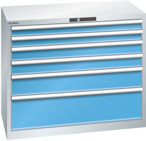 "longDescription": "LISTA Schubladenschrank, Lista Einheit: 54x27E, BxTxH: 1023x572x850mm, Schubladen-Nutzfläche BxT: 918x459mm, Anzahl Schubladen: 6, Anzahl Fronthöhen (Tragkraft): 2x75mm (75kg), 2x100mm (75kg), 1x150mm (75kg), 1x250mm (200kg), Schliessart: Key Lock, Standard-Schliessung mit Wechselyzlinder inkl. 2 Schlüsseln mit Schlüsselnummer, Farbe Gehäuse: Lichtgrau RAL 7035, Farbe Schubladen: Lichtblau RAL 5012. Höchste Stabilität: Gehäuse bis 4t belastbar, Schubladen mit 75 oder 200 kg Tragkraft. Maximale Ausnutzung dank Vollauszug und optimaler Mantelhöhe der Schubladen. Exzellente Schutzeigenschaften gegen Schmutz, Flüssigkeiten und mechanische Beanspruchung durch geschlossenes Gehäuse mit schlag- und abriebfester Oberfläche. Überzeugende Sicherheit: Aushebesicherung gegen Herausfallen der Schubladen und Einzelschubladensperre als Kippschutz. Korrosionsschutz durch Elektrophorese-Tauchlackierung und umweltfreundlichen Pulverlack. Optimale Ordnung und Organisation dank speziellem LISTA-Einteilungsmaterial für jeden Zweck und gelochter, geschlitzter Schubladen. Professionelle Beschriftung mit Beschriftungssoftware LISTA Script und hochklappbarer Griffleiste zum Einlegen der Etiketten. Perfekte Laufruhe durch traversenlos geführten Differenzialauszug. Flexible Anpassungsmöglichkeiten durch vorperforierte Löcher für Tischplatten (Punchout), Rollen, Schubladen, Schliesssysteme für einfaches Um- und Nachrüsten<br>",