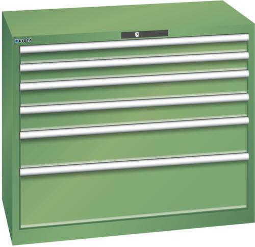 "longDescription": "LISTA Schubladenschrank, Lista Einheit: 54x27E, BxTxH: 1023x572x850mm, Schubladen-Nutzfläche BxT: 918x459mm, Anzahl Schubladen: 6, Anzahl Fronthöhen (Tragkraft): 2x75mm (75kg), 2x100mm (75kg), 1x150mm (75kg), 1x250mm (200kg), Schliessart: Code Lock, elektronisches Zahlenschloss mit 10 Ziffern für 4- bis 6-stellige Codes, bis 100 Codes, Farbe Gehäuse: Resedagrün RAL 6011, Farbe Schubladen: Resedagrün RAL 6011. Höchste Stabilität: Gehäuse bis 4t belastbar, Schubladen mit 75 oder 200 kg Tragkraft. Maximale Ausnutzung dank Vollauszug und optimaler Mantelhöhe der Schubladen. Exzellente Schutzeigenschaften gegen Schmutz, Flüssigkeiten und mechanische Beanspruchung durch geschlossenes Gehäuse mit schlag- und abriebfester Oberfläche. Überzeugende Sicherheit: Aushebesicherung gegen Herausfallen der Schubladen und Einzelschubladensperre als Kippschutz. Korrosionsschutz durch Elektrophorese-Tauchlackierung und umweltfreundlichen Pulverlack. Optimale Ordnung und Organisation dank speziellem LISTA-Einteilungsmaterial für jeden Zweck und gelochter, geschlitzter Schubladen. Professionelle Beschriftung mit Beschriftungssoftware LISTA Script und hochklappbarer Griffleiste zum Einlegen der Etiketten. Perfekte Laufruhe durch traversenlos geführten Differenzialauszug. Flexible Anpassungsmöglichkeiten durch vorperforierte Löcher für Tischplatten (Punchout), Rollen, Schubladen, Schliesssysteme für einfaches Um- und Nachrüsten<br>",