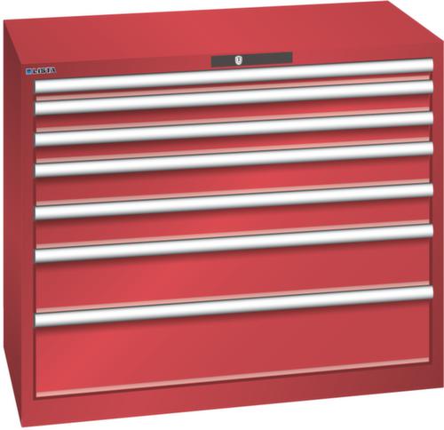 "longDescription": "LISTA Schubladenschrank, Lista Einheit: 54x27E, BxTxH: 1023x572x850mm, Schubladen-Nutzfläche BxT: 918x459mm, Anzahl Schubladen: 7, Anzahl Fronthöhen (Tragkraft): 1x50mm (75kg), 2x75mm (200kg), 2x100mm (200kg), 1x150mm (200kg), 1x200mm (200kg), Schliessart: Key Lock, Standard-Schliessung mit Wechselyzlinder inkl. 2 Schlüsseln mit Schlüsselnummer, Farbe Gehäuse: Rubinrot RAL 3003, Farbe Schubladen: Rubinrot RAL 3003. Höchste Stabilität: Gehäuse bis 4t belastbar, Schubladen mit 75 oder 200 kg Tragkraft. Maximale Ausnutzung dank Vollauszug und optimaler Mantelhöhe der Schubladen. Exzellente Schutzeigenschaften gegen Schmutz, Flüssigkeiten und mechanische Beanspruchung durch geschlossenes Gehäuse mit schlag- und abriebfester Oberfläche. Überzeugende Sicherheit: Aushebesicherung gegen Herausfallen der Schubladen und Einzelschubladensperre als Kippschutz. Korrosionsschutz durch Elektrophorese-Tauchlackierung und umweltfreundlichen Pulverlack. Optimale Ordnung und Organisation dank speziellem LISTA-Einteilungsmaterial für jeden Zweck und gelochter, geschlitzter Schubladen. Professionelle Beschriftung mit Beschriftungssoftware LISTA Script und hochklappbarer Griffleiste zum Einlegen der Etiketten. Perfekte Laufruhe durch traversenlos geführten Differenzialauszug. Flexible Anpassungsmöglichkeiten durch vorperforierte Löcher für Tischplatten (Punchout), Rollen, Schubladen, Schliesssysteme für einfaches Um- und Nachrüsten<br>",