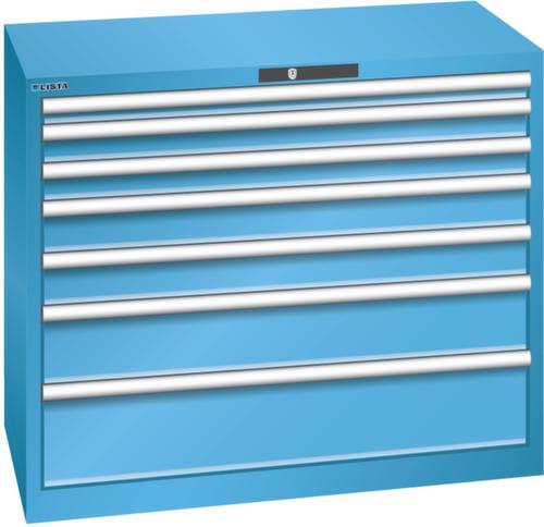 "longDescription": "LISTA Schubladenschrank, Lista Einheit: 54x27E, BxTxH: 1023x572x850mm, Schubladen-Nutzfläche BxT: 918x459mm, Anzahl Schubladen: 7, Anzahl Fronthöhen (Tragkraft): 1x50mm (75kg), 2x75mm (200kg), 2x100mm (200kg), 1x150mm (200kg), 1x200mm (200kg), Schliessart: Code Lock, elektronisches Zahlenschloss mit 10 Ziffern für 4- bis 6-stellige Codes, bis 100 Codes, Farbe Gehäuse: Lichtblau RAL 5012, Farbe Schubladen: Lichtblau RAL 5012. Höchste Stabilität: Gehäuse bis 4t belastbar, Schubladen mit 75 oder 200 kg Tragkraft. Maximale Ausnutzung dank Vollauszug und optimaler Mantelhöhe der Schubladen. Exzellente Schutzeigenschaften gegen Schmutz, Flüssigkeiten und mechanische Beanspruchung durch geschlossenes Gehäuse mit schlag- und abriebfester Oberfläche. Überzeugende Sicherheit: Aushebesicherung gegen Herausfallen der Schubladen und Einzelschubladensperre als Kippschutz. Korrosionsschutz durch Elektrophorese-Tauchlackierung und umweltfreundlichen Pulverlack. Optimale Ordnung und Organisation dank speziellem LISTA-Einteilungsmaterial für jeden Zweck und gelochter, geschlitzter Schubladen. Professionelle Beschriftung mit Beschriftungssoftware LISTA Script und hochklappbarer Griffleiste zum Einlegen der Etiketten. Perfekte Laufruhe durch traversenlos geführten Differenzialauszug. Flexible Anpassungsmöglichkeiten durch vorperforierte Löcher für Tischplatten (Punchout), Rollen, Schubladen, Schliesssysteme für einfaches Um- und Nachrüsten<br>",