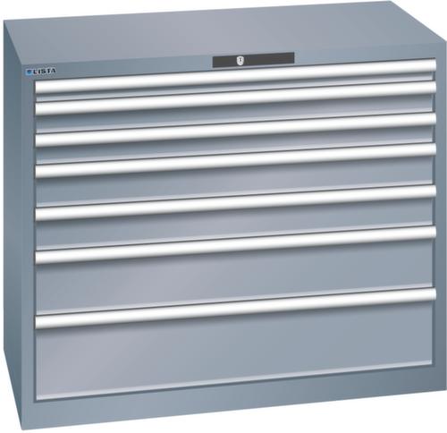 "longDescription": "LISTA Schubladenschrank, Lista Einheit: 54x27E, BxTxH: 1023x572x850mm, Schubladen-Nutzfläche BxT: 918x459mm, Anzahl Schubladen: 7, Anzahl Fronthöhen (Tragkraft): 1x50mm (75kg), 2x75mm (200kg), 2x100mm (200kg), 1x150mm (200kg), 1x200mm (200kg), Schliessart: Code Lock, elektronisches Zahlenschloss mit 10 Ziffern für 4- bis 6-stellige Codes, bis 100 Codes, Farbe Gehäuse: Grau metallic NCS S 6502-B, Farbe Schubladen: Grau metallic NCS S 6502-B. Höchste Stabilität: Gehäuse bis 4t belastbar, Schubladen mit 75 oder 200 kg Tragkraft. Maximale Ausnutzung dank Vollauszug und optimaler Mantelhöhe der Schubladen. Exzellente Schutzeigenschaften gegen Schmutz, Flüssigkeiten und mechanische Beanspruchung durch geschlossenes Gehäuse mit schlag- und abriebfester Oberfläche. Überzeugende Sicherheit: Aushebesicherung gegen Herausfallen der Schubladen und Einzelschubladensperre als Kippschutz. Korrosionsschutz durch Elektrophorese-Tauchlackierung und umweltfreundlichen Pulverlack. Optimale Ordnung und Organisation dank speziellem LISTA-Einteilungsmaterial für jeden Zweck und gelochter, geschlitzter Schubladen. Professionelle Beschriftung mit Beschriftungssoftware LISTA Script und hochklappbarer Griffleiste zum Einlegen der Etiketten. Perfekte Laufruhe durch traversenlos geführten Differenzialauszug. Flexible Anpassungsmöglichkeiten durch vorperforierte Löcher für Tischplatten (Punchout), Rollen, Schubladen, Schliesssysteme für einfaches Um- und Nachrüsten<br>",